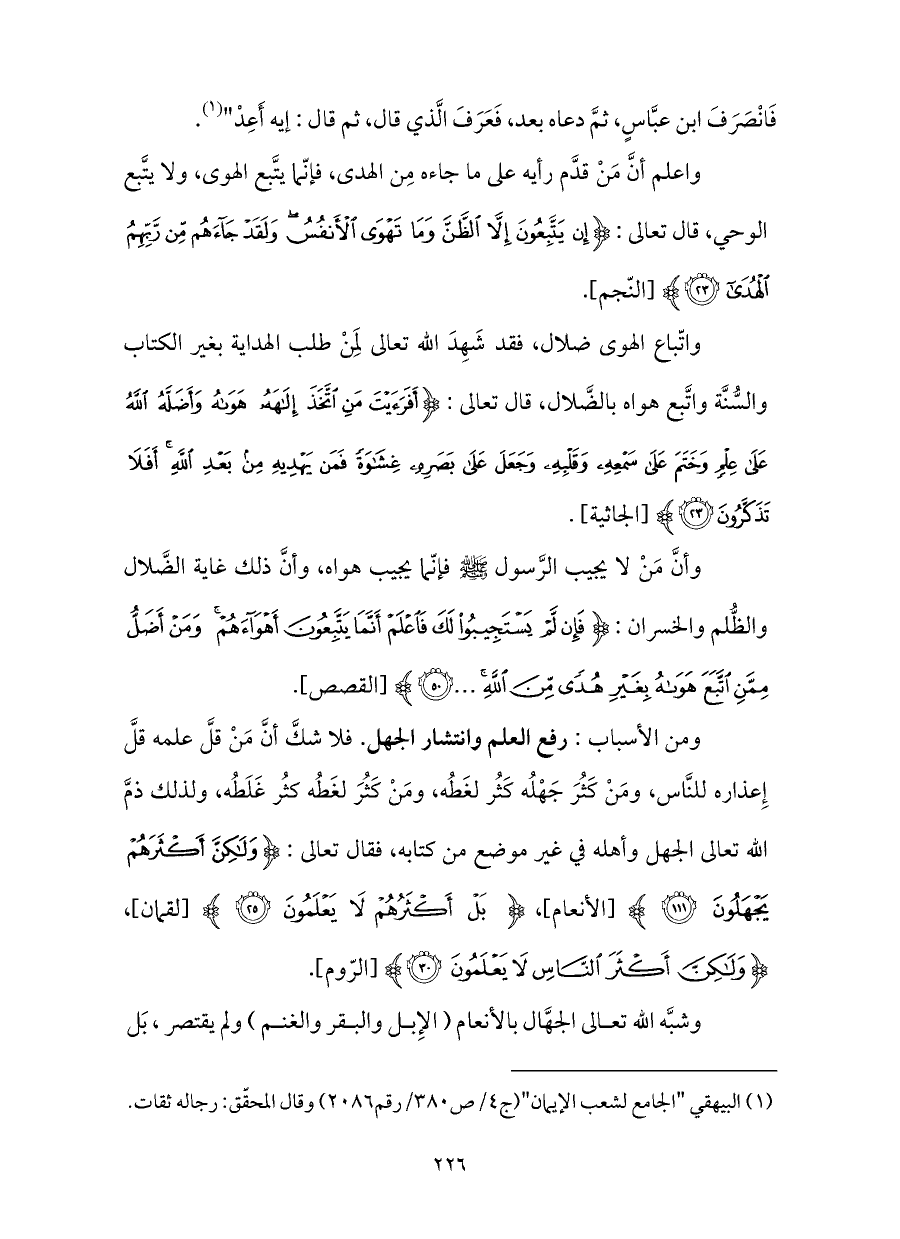 واعلم مَنْ قدَّم رأيه على ما جاءه مِن الهدى، فإنّما يتَّبع الهوى، ولا يتَّبع الوحي، قال تعالى: {إِنْ يَتَّبِعُونَ إِلَّا الظَّنَّ وَمَا تَهْوَى الْأَنْفُسُ وَلَقَدْ جَاءَهُمْ مِنْ رَبِّهِمُ الْهُدَى (٢٣)} [النّجم].