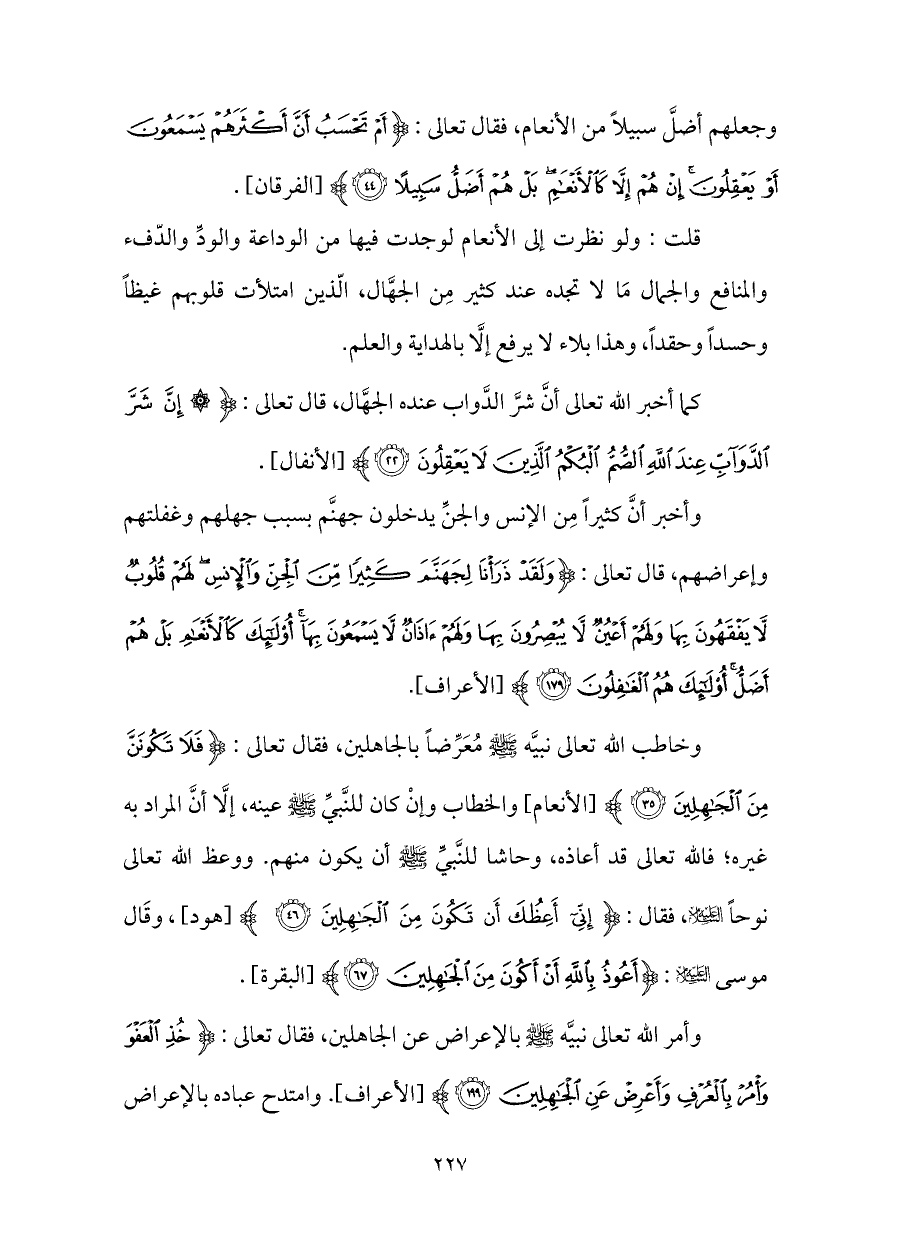 كما أخبر الله تعالى أنَّ شرَّ الدَّواب عنده الجهَّال، قال تعالى: {إِنَّ شَرَّ الدَّوَابِّ عِنْدَ اللَّهِ الصُّمُّ الْبُكْمُ الَّذِينَ لَا يَعْقِلُونَ (٢٢)} [الأنفال]. وأخبر أنَّ كثيراً مِن الإنس والجنِّ يدخلون جهنَّم بسبب جهلهم وغفلتهم وإعراضهم، قال تعالى: {وَلَقَدْ ذَرَأْنَا لِجَهَنَّمَ كَثِيرًا مِنَ الْجِنِّ وَالْإِنْسِ لَهُمْ قُلُوبٌ لَا يَفْقَهُونَ بِهَا وَلَهُمْ أَعْيُنٌ لَا يُبْصِرُونَ بِهَا وَلَهُمْ آذَانٌ لَا يَسْمَعُونَ بِهَا أُولَئِكَ كَالْأَنْعَامِ بَلْ هُمْ أَضَلُّ أُولَئِكَ هُمُ الْغَافِلُونَ (١٧٩)} [الأعراف]. وخاطب الله تعالى نبيَّه - صلى الله عليه وسلم - مُعَرِّضاً بالجاهلين، فقال تعالى: {فَلَا تَكُونَنَّ مِنَ الْجَاهِلِينَ (٣٥)} [الأنعام] والخطاب وإنْ كان للنَّبيِّ - صلى الله عليه وسلم - عينه، إلَّا أنَّ المراد به غيره؛ فالله تعالى قد أعاذه، وحاشا للنَّبيِّ - صلى الله عليه وسلم - أن يكون منهم. ووعظ الله تعالى نوحاً - عليه السلام -، فقال: {إِنِّي أَعِظُكَ أَنْ تَكُونَ مِنَ الْجَاهِلِينَ (٤٦)} [هود]، وقَال موسى - عليه السلام -: {أَعُوذُ بِاللَّهِ أَنْ أَكُونَ مِنَ الْجَاهِلِينَ (٦٧)} [البقرة].