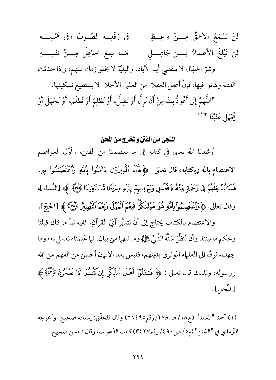 (¬١) أحمد "المسند" (ج ١٨/ص ٢٧٨/رقم ٢٦٤٩٥) وقال المحقّق: إسناده صحيح. وأخرجه التّرمذي في "السّنن" (م ٥/ص ٤٩٠/رقم ٣٤٢٧) كتاب الدَعوات، وقال: حسن صحيح.