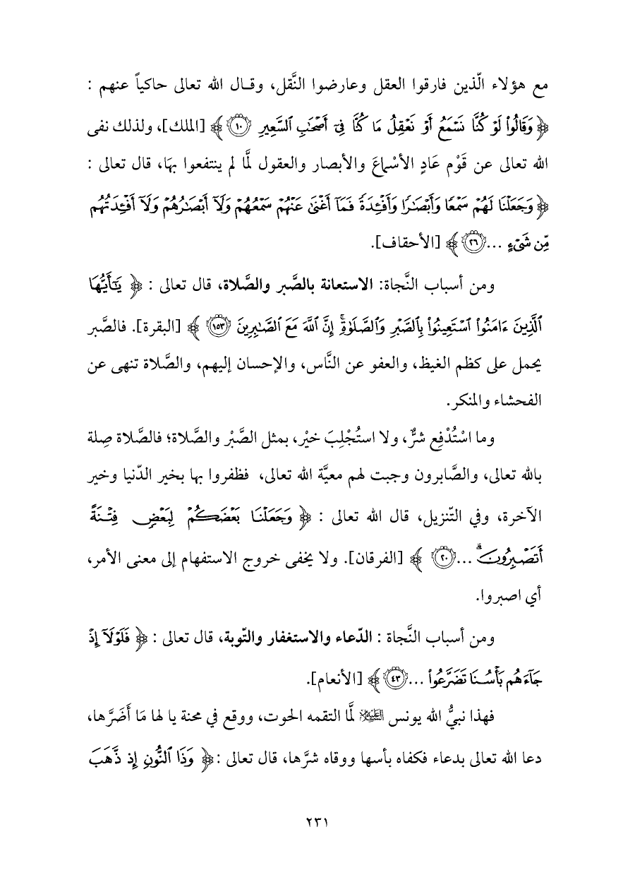 ومن أسباب النَّجاة: الدّعاء والاستغفار والتّوبة، قال تعالى: {فَلَوْلَا إِذْ جَاءَهُمْ بَأْسُنَا تَضَرَّعُوا (٤٣)} [الأنعام].