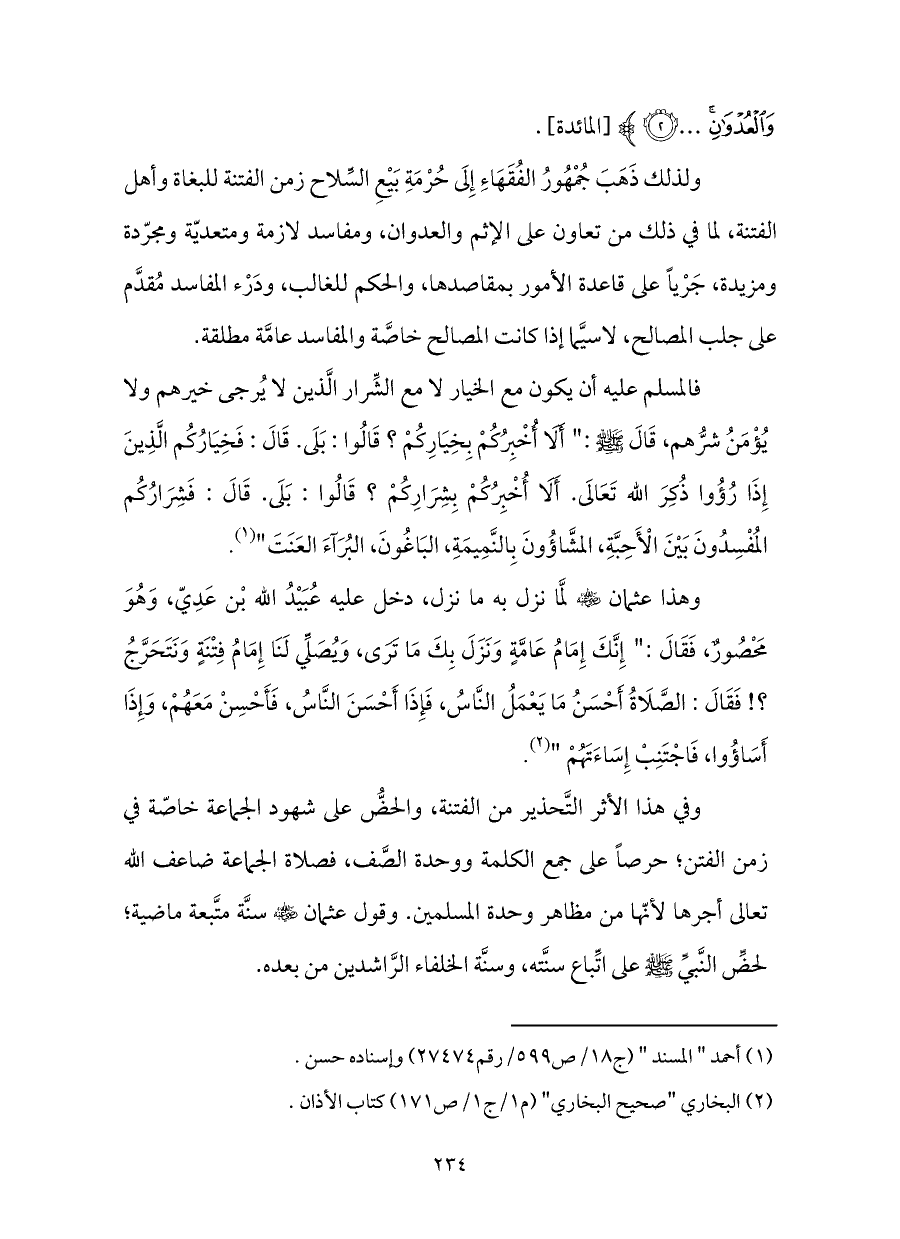 وهذا عثمان - رضي الله عنه - لمَّا نزل به ما نزل، دخل عليه عُبَيْدُ الله بْن عَدِيّ، وَهُوَ مَحْصُورٌ، فَقَالَ: "إِنَّكَ إِمَامُ عَامَّةٍ وَنَزَلَ بِكَ مَا نَرَى، وَيُصَلِّي لَنَا إِمَامُ فِتْنَةٍ وَنَتَحَرَّجُ؟! فَقَالَ: الصَّلَاةُ أَحْسَنُ مَا يَعْمَلُ النَّاسُ، فَإِذَا أَحْسَنَ النَّاسُ، فَأَحْسِنْ مَعَهُمْ، وَإِذَا أَسَاؤُوا، فَاجْتَنِبْ إِسَاءَتَهُمْ " (¬٢).