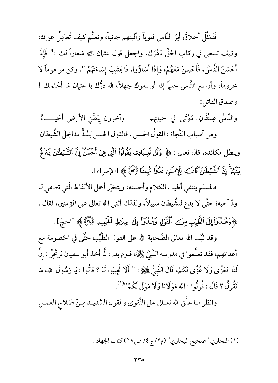 وقد ثبَّت الله تعالى الصَّحابة - رضي الله عنهم - على القول الطَّيِّب حتَّى في الخصومة مع أعدائهم، فقد تعلَّموا في مدرسة النَّبيِّ - صلى الله عليه وسلم -، فيوم بدر، لمَّا أخذ أبو سفيان يَرْتَجِزُ: إِنَّ لَنَا العُزَّى وَلَا عُزَّى لَكُمْ، قَالَ النَّبِيُّ - صلى الله عليه وسلم -: " أَلَا تُجِيبُوا لَهُ؟ قَالُوا: يَا رَسُولَ الله، مَا نَقُولُ؟ قَالَ: قُولُوا: الله مَوْلَانَا وَلَا مَوْلَى لَكُمْ" (¬١).