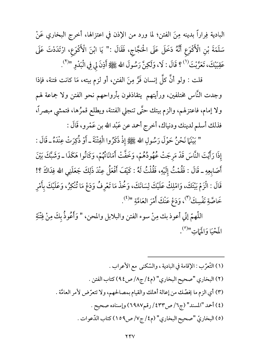 البادية فِراراً بدينه مِنَ الفتن؛ لما ورد من الإذن في اعتزالها، أخرج البخاري عَنْ سَلَمَةَ بْنِ الْأَكْوَعِ أَنَّهُ دَخَلَ عَلَى الْحَجَّاجِ، فَقَالَ: "يَا ابْنَ الْأَكْوَعِ، ارْتَدَدْتَ عَلَى عَقِبَيْكَ، تَعَرَّبْتَ (¬١)؟ قَالَ: لَا، وَلَكِنَّ رَسُولَ الله - صلى الله عليه وسلم - أَذِنَ لِي فِي الْبَدْوِ " (¬٢).