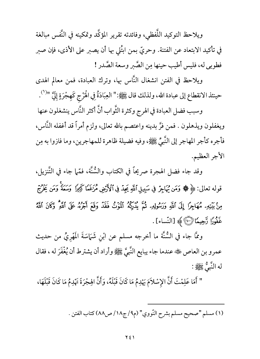 ويلاحظ في الفتن انشغال النَّاس بها، وترك العبادة، فمن معالم الهدى حينئذ الانقطاع إلى عبادة الله، ولذلك قال - صلى الله عليه وسلم -: "العِبَادَةُ فِي الْهَرْجِ كَهِجْرَةٍ إِلَيَّ " (¬١).
