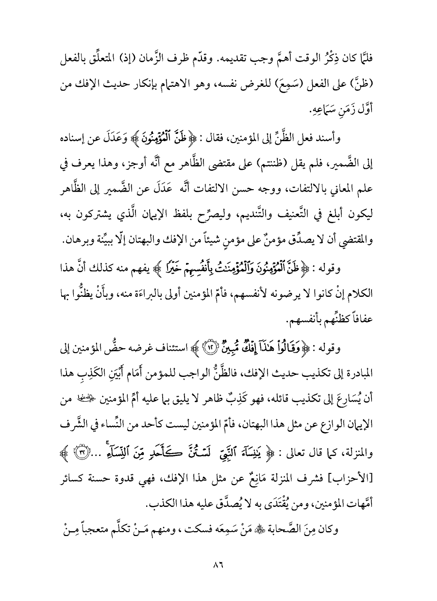 وقوله: {ظَنَّ الْمُؤْمِنُونَ وَالْمُؤْمِنَاتُ بِأَنْفُسِهِمْ خَيْرًا} يفهم منه كذلك أنَّ هذا الكلام إنْ كانوا لا يرضونه لأنفسهم، فأمّ المؤمنين أولى بالبراءَة منه، وبأَنْ يظنُّوا بها عفافاً كظنِّهم بأنفسهم.