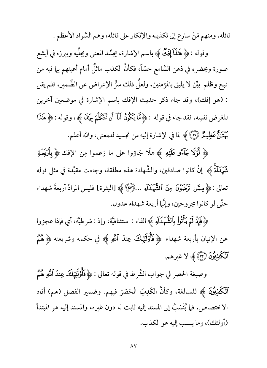 وقوله: {هَذَا إِفْكٌ} باسم الإشارة، يجسِّد المعنى ويجلِّيه ويبرزه في أبشع صورة ويحضره في ذهن السَّامع حسّاً، فكأنَّ الكذب ماثلٌ أمام أعينهم بما فيه من قبح وظلم بيِّن لا يليق بالمؤمنين، ولعلَّ ذلك سرُّ الإعراض عن الضَّمير، فلم يقل: (هو إفك)، وقد جاء ذكر حديث الإفك باسم الإشارة في موضعين آخرين للغرض نفسِه، فقد جاء في قوله: {مَا يَكُونُ لَنَا أَنْ نَتَكَلَّمَ بِهَذَا}، وقوله: {هَذَا بُهْتَانٌ عَظِيمٌ (١٦)} لما في الإشارة إليه من تجسيد للمعنى، والله أعلم.