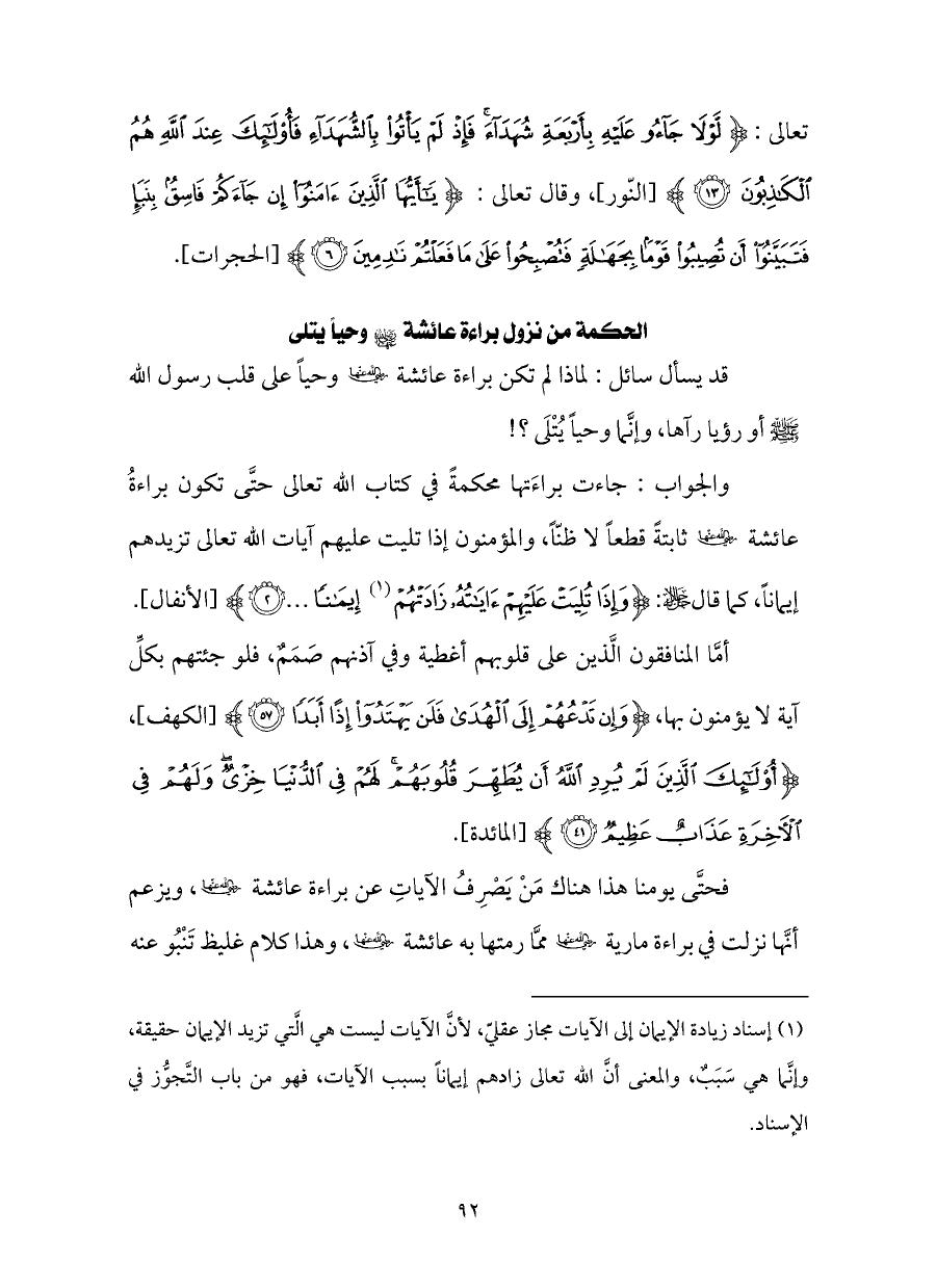 والجواب: جاءت براءَتها محكمةً في كتاب الله تعالى حتَّى تكون براءةُ عائشة - رضي الله عنها - ثابتةً قطعاً لا ظنّاً، والمؤمنون إذا تليت عليهم آيات الله تعالى تزيدهم إيماناً، كما قال - جل جلاله -: {وَإِذَا تُلِيَتْ عَلَيْهِمْ آيَاتُهُ زَادَتْهُمْ (¬١) إِيمَانًا (٢)} [الأنفال].