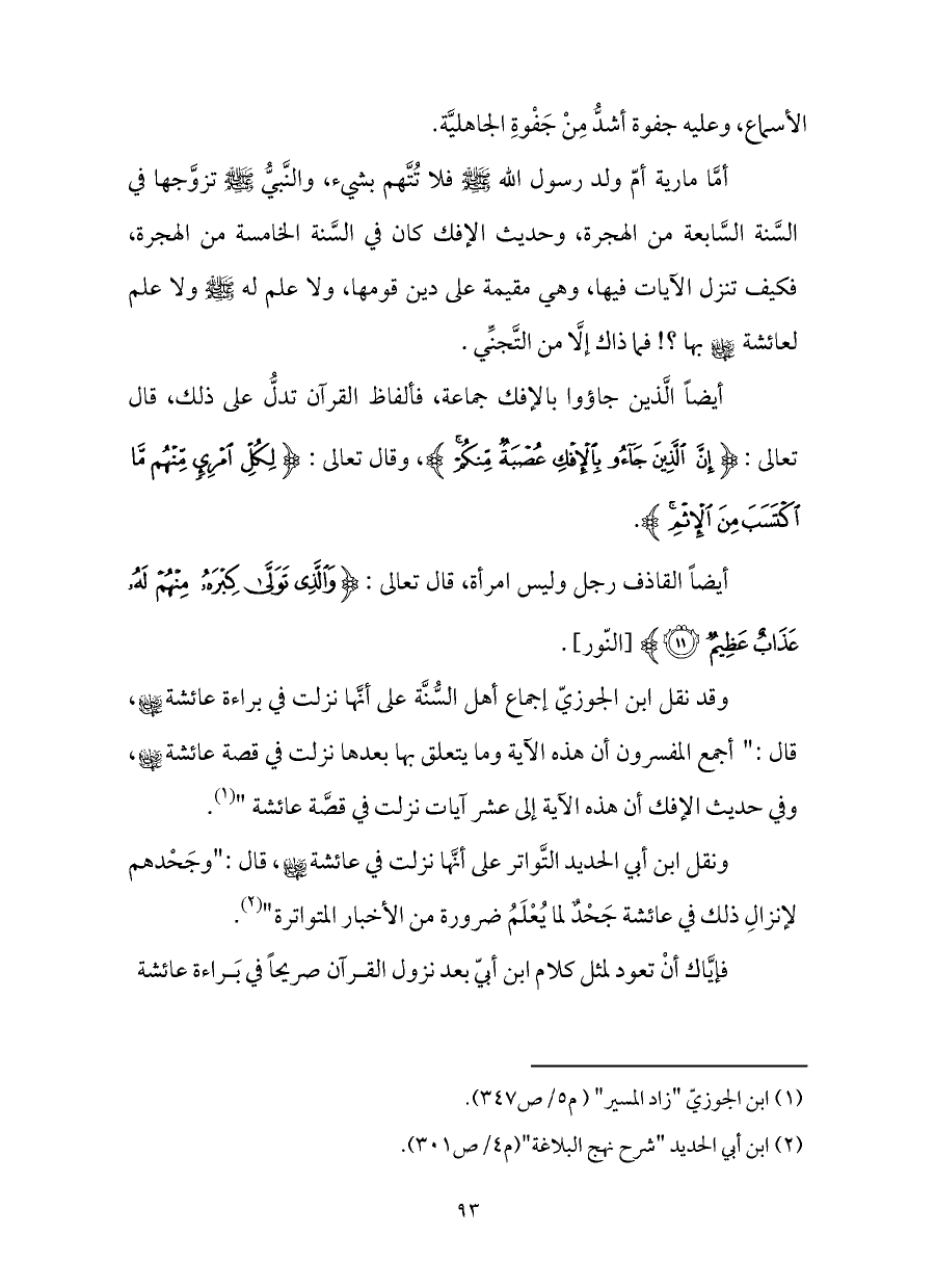 ونقل ابن أبي الحديد التَّواتر على أنَّها نزلت في عائشة - رضي الله عنها -، قال:"وجَحْدهم لإنزالِ ذلك في عائشة جَحْدٌ لما يُعْلَمُ ضرورة من الأخبار المتواترة" (¬٢).