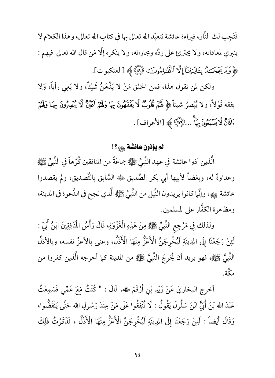 فَتَجِب لك النَّار، فبراءة عائشة نتعبّد الله تعالى بها في كتاب الله تعالى، وهذا الكلام لا ينبري لمعاداته، ولا يجترئ على ردِّه ومجاراته، ولا ينكره إلّا مَن قال الله تعالى فيهم: {وَمَا يَجْحَدُ بِآيَاتِنَا إِلَّا الظَّالِمُونَ (٤٩)} [العنكبوت].