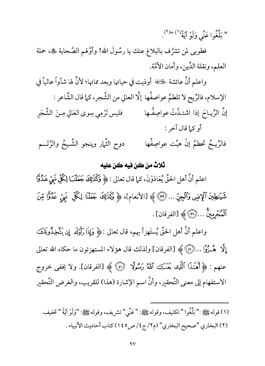 (¬١) قوله - صلى الله عليه وسلم -: "بَلِّغُوا " تكليف، وقوله - صلى الله عليه وسلم -: " عَنِّي" تشريف، وقوله - صلى الله عليه وسلم -: "وَلَوْ آيَةً " تخفيف.