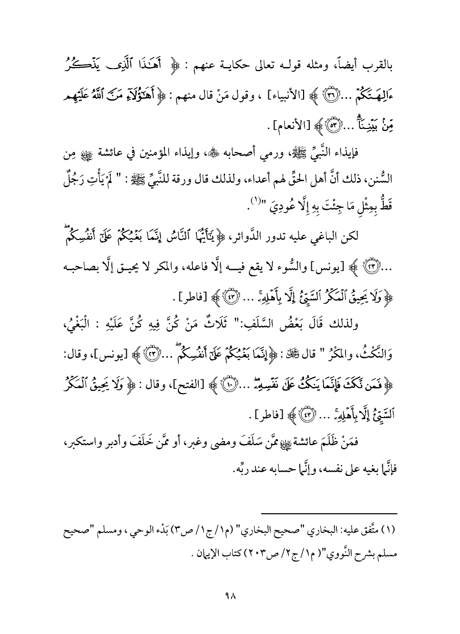 ولذلك قَالَ بَعْضُ السَّلَفِ: "ثَلَاثٌ مَنْ كُنَّ فِيهِ كُنَّ عَلَيْهِ: الْبَغْيُ، وَالنَّكْثُ، والمكْرُ " قال - عز وجل -: {إِنَّمَا بَغْيُكُمْ عَلَى أَنْفُسِكُمْ (٢٣)} [يونس]، وقال: {فَمَنْ نَكَثَ فَإِنَّمَا يَنْكُثُ عَلَى نَفْسِهِ (١٠)} [الفتح]، وقال: {وَلَا يَحِيقُ الْمَكْرُ السَّيِّئُ إِلَّا بِأَهْلِهِ (٤٣)} [فاطر].