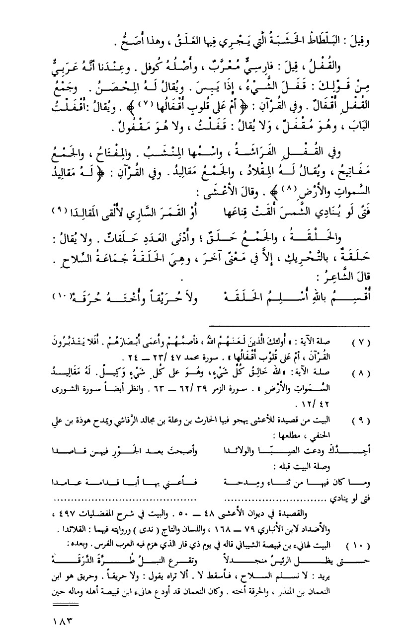 وفي القفلِ الفراشةُ، واسمُها المنشبُ. والمفتاحُ، والجمعُ مفاتيحُ، ويُقالُ لهُ المقلادُ، والجمعُ مقاليدُ. وفي القرآنِ: {لَهُ مَقَالِيدُ السَّمَاوَاتِ وَالْأَرْضِ} وقالَ الأعشَى: