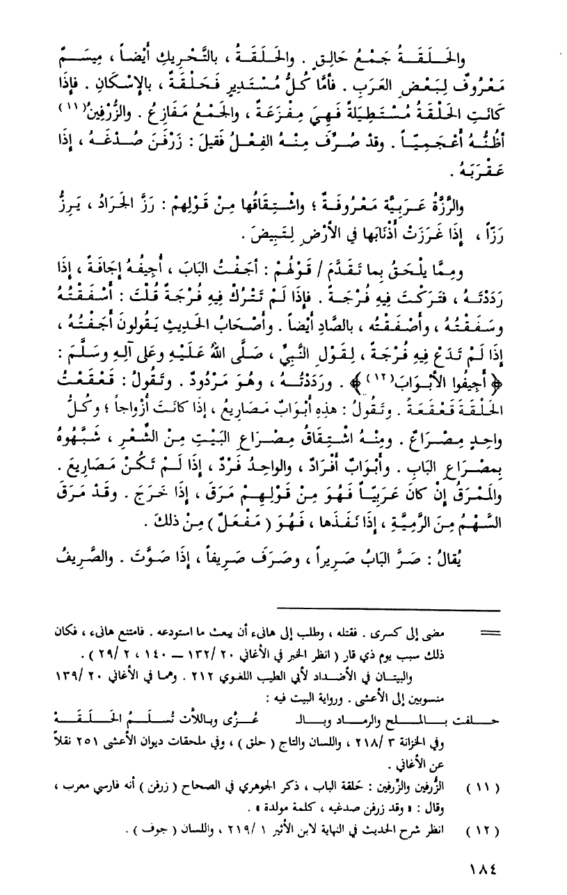 والحلقةُ جمعُ حالقٍ. والحلقةُ، بالتَّحريكِ أيضاً، ميسمٌ معروفٌ لبعضِ العربِ. فأمَّا كلٌّ مستديرٍ فحلقةٌ، بالإسكانِ. فإذا كانتِ الحلقةُ مستطيلةٌ فهي مفزعةٌ، والجمعُ مفازعُ. والزُّرفينُ أظنُّهُ أعجميّاً. وقدْ صرِّف منهُ الفعلُ فقيلَ: زرفنَ صدغهُ، إِذَا عقربهُ.