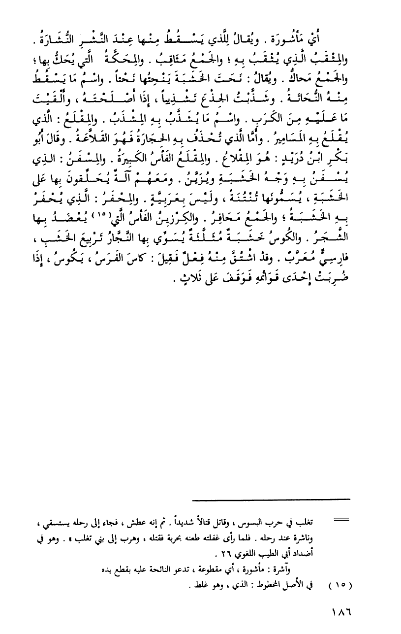 أيْ مأشورة. ويُقالُ للَّذي يسقطُ منْها عندَ النَّشرِ النُّشارةُ. والمثقبُ الَّذِي يثقبُ بهِ، والجمعُ مثاقبُ. والمحكَّةُ الَّتِي يحكُّ بها، والجمعُ محاكُّ. ويُقالُ: نحتَ الخشبةَ ينحتُها نحتاً. واسمُ ما يسقطُ منهُ النحاتةُ. وشذَّبتُ الجذعَ تشذيباً، إِذَا أصلحتهُ، وألقيتَ ما عليهِ منَ الكربِ. واسمُ ما يشذَّبُ بهِ المشذبُ. والمقلعُ: الَّذِي يقلعُ بهِ المساميرُ. وأمَّا الَّذِي تحذفُ بهِ الحجارةُ فهوَ القلاَّعةُ. وقالَ أبُو بكِر ابنُ دريدٍ: هوَ المقلاعُ. والمقلعُ الفأسُ الكبيرةُ. والمسفنُ: الَّذِي يسفنُ بهِ وجهُ الخشبةِ ويزيَّنُ. ومعهمْ آلةٌ يحلَّقونَ بها عَلى الخشبةِ، يسمُّونها تنتنةً، وليسَ بعربيَّةٍ. والمحفرُ: الَّذِي يحفرُ بهِ الخشبةُ، والجمعُ محافرُ. والكرزينُ الفأسُ الَّتِي يعضدُ بها الشَّجرُ. والكُوسُ خشبةٌ مثلَّثةٌ يسوِّي بها النَّجَّارُ تربيعَ الخشبِ، فارسيٌّ معرَّبٌ. وقدْ اشتقَّ منهُ فعلٌ فقيلَ: كاسَ الفرسُ، يكوسُ، إِذَا ضربتْ إحدَى قوائمهِ فوقفَ على ثلاثٍ.