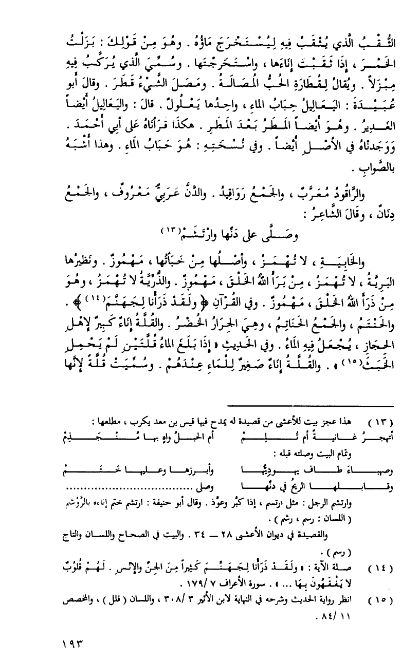 والخابيةِ، لا تهمزُ، وأصلُها منْ خبأتُها، مهموزٌ. ونظيرُها البريَّةُ، لا تهمزُ، منْ برأ الله الخلقَ، مهموزٌ. والذريَّةُ لا تهمزُ، وهوَ منْ ذرَأ الله الخلقَ، مهموزٌ. وفي القرآنِ {وَلَقَدْ ذَرَأْنَا لِجَهَنَّمَ}. والحنتمُ، والجمعُ الحناتمُ، وهيَ الجرارُ الخضرُ، والقلَّةُ إناءٌ كبير لأهلِ الحجازِ، يجعلُ فيهِ الماءُ. وفي الحديثِ إذَا بلغَ الماءُ قلَّتينِ لمْ يحملِ الخبثَ. والقلَّةُ إناءٌ صغيرٌ للماءِ عندهمْ. وسمِّيتْ قلَّةً لأنَّها