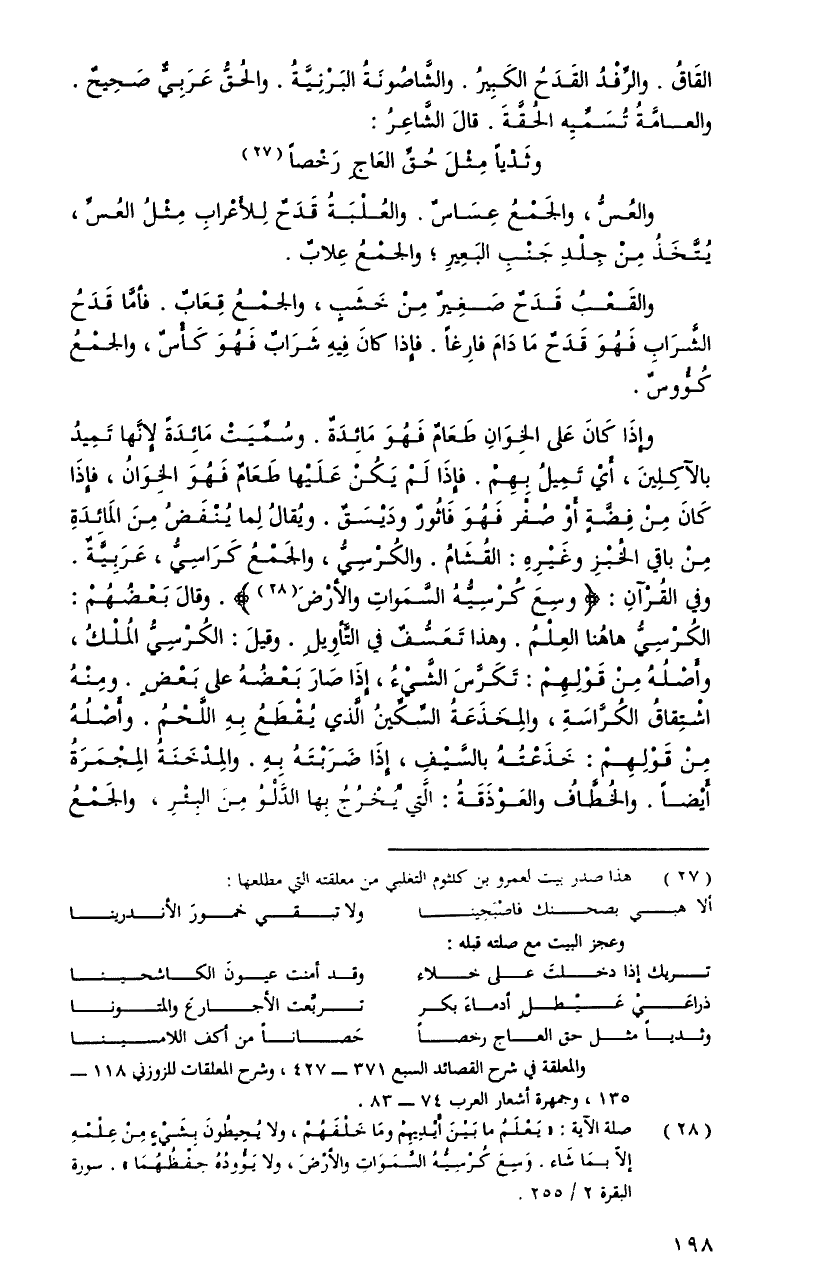 وإذا كانَ على الخوانِ طعامٌ فهوَ مائدةٌ. وسمِّيتْ مائدةٌ لأنَّها تميدُ بالآكلينَ، أيْ تميلُ بهمْ. فإذا لمْ يكنْ عليْها طعامٌ فهوَ الخوانُ، فإذا كانَ منْ فضَّةٍ أو صفْر فهوَ فاثورٌ وديسقٌ. ويُقالُ لما ينفضُ منَ المائدةٍ منْ باقي الخبزِ وغيرهِ. القشامُ. والكرسيُّ، والجمعُ كراسيُّ، عربيَّةٌ. وفي القرآنِ: {وَسِعَ كُرْسِيُّهُ السَّمَاوَاتِ وَالأَرْضَ}. وقالَ بعضهمْ: الكرسيُّ ها هُنا العلمُ. وهذا تعسُّفٌ فِي التَّأويلِ. وقيلَ: الكرسيُّ الملكُ، وأصلهُ منْ قولهمْ: تكرَّسَ الشَّيءُ، إِذَا صارَ بعضهُ على بعضٍ. ومنهُ اشتقاقُ الكرَّاسةِ، والمخذعةُ السِّكِّينُ الَّذِي يقطعُ بهِ اللَّحمُ. وأصلهُ