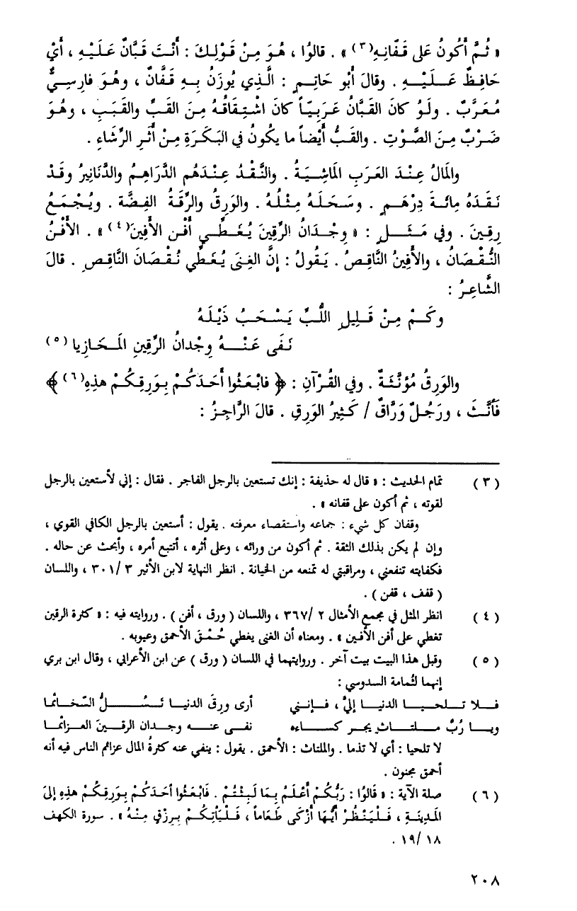 والمالُ عندَ العربِ الماشيةُ. والنَّقدُ عندهُم الدَّراهمُ والدَّنانيرُ وقدْ نقدهُ مائةَ درهمٍ. وسحلَهُ مثلُهُ. والورقُ والرِّقةِ الفضَّة. ويجمعُ رقينَ. وفي مثلٍ: وجدانُ الرِّقينَ يغطِّي أفْن الأفينَ. الأفنُ النُّقصانُ، والأفينُ النَّاقصُ. يقولُ: إنَّ الغنى يُغطى نُقصانَ النَّاقصِ. قالَ الشَّاعرُ:
