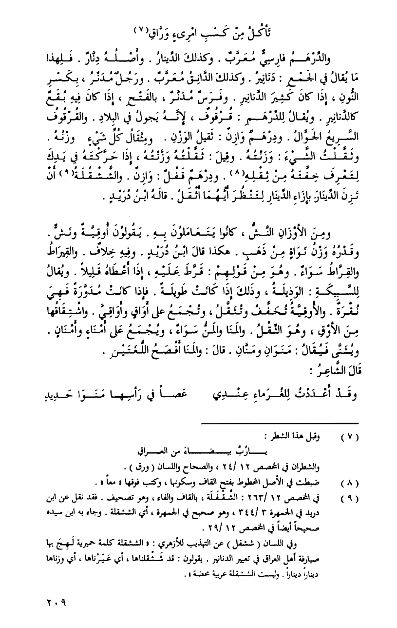 ومنَ الأوزانِ النَّشُّ، كانُوا يتعاملونَ بهِ. يقولوُنَ أوقيَّةٌ ونشٌّ. وقدرُهُ وزنُ نواةٍ منْ ذهبِ. هكَذَا قالَ ابنُ دريدٍ. وفيِهِ خلافٌ. والقيراطُ والقرَّاطُ سواءٌ. وهوَ منْ قولهمْ: قرَّطَ عليهِ، إِذَا أعطاهُ قليلاً. ويُقالُ للسَّبيكةِ: الوذيلةُ، وذلكَ إِذَا كانتْ طويلةُ. فإذا كانتْ مدوَّرةٌ فهيَ نقرةٌ. والأوقيَّةُ تخفَّفُ وتثقَّلُ، وتجمعُ على أوراقٍ وأواقيَّ. واشتقاقُها منَ الأوقٍ، وهوَ الثِّقلُ. والمنَا والمنُّ سواءٌ، ويجمعُ على أمناءٍ وأمنَانٍ. ويثنَّى فيُقالُ: منوانِ ومنَّانِ. قالَ: والمنَا أفصحُ اللُّغتينِ.