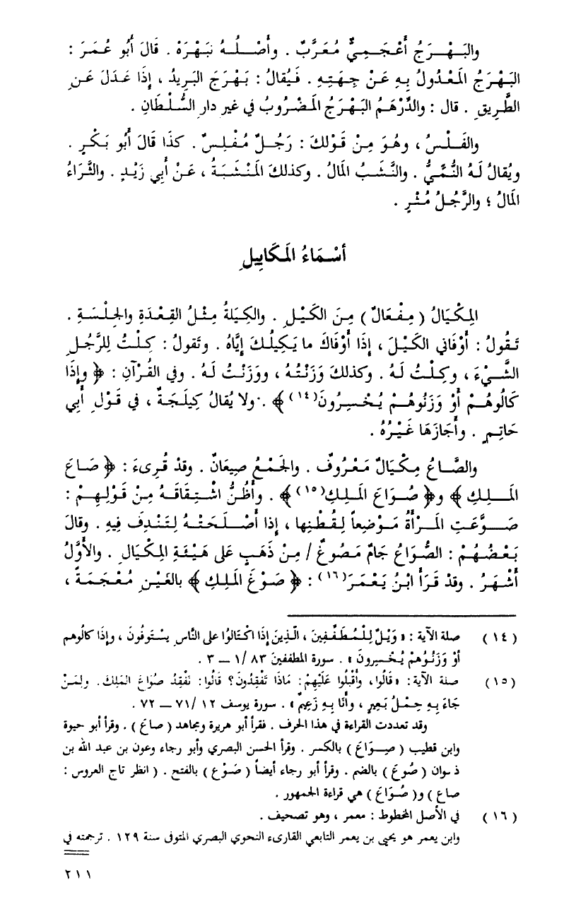 المكيالُ (مُفعالٌ) منَ الكيلِ. والكيلةُ مثلُ القعدةِ والجلسةِ. تقولُ: أوفاني الكيلَ، إِذَا أوفاكَ ما يكيلكَ إيَّاهُ. وتقولُ: كلتُ للرَّجلِ الشَّيءَ: وكلتُ لهُ. وكذلكَ وزنتُهُ، ووزنتُ لهُ. وفي القرآنِ: {وَإِذَا كَالُوهُمْ أَو وَّزَنُوهُمْ يُخْسِرُونَ}. ولا يُقالُ كيلجةٌ، فِي قولِ أبي حاتمٍ. وأجازهَا غيرهُ.