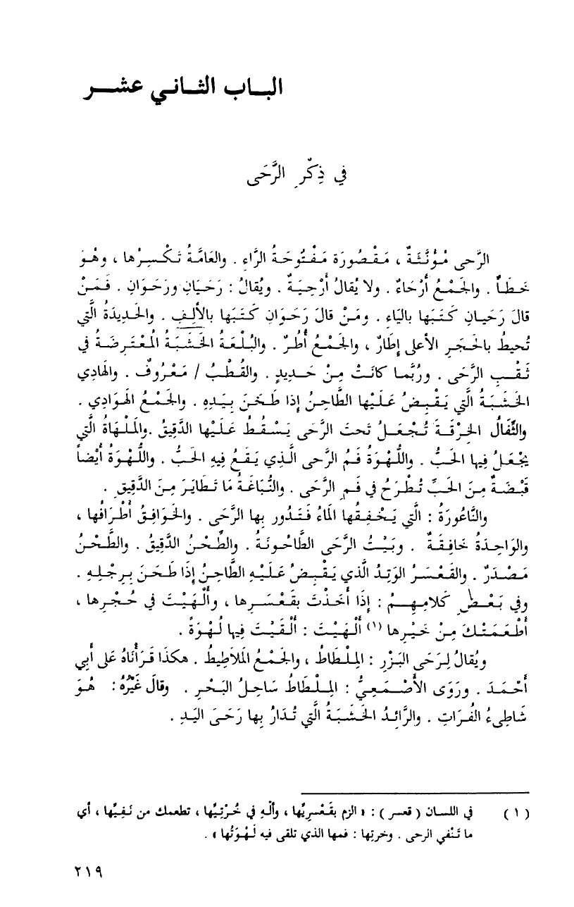 الرَّحى مؤنَّثةٌ، مقصورة مفتوحةُ الرَّاء. والعامَّةُ تكسرُها، وهوَ خطاً. والجمعُ أرحاءُّ. ولا يُقالُ أرحيةٌ. ويُقالُ: رحيانِ ورحوانِ. فمنْ قالَ رحيانِ كتبها بالياءِ. ومنْ قالَ رحوانِ كتبها بالألفِ. والحديدةُ الَّتِي تحيطُ بالحجرِ الأعلى إطارٌ، والجمعُ أطرٌ. والبلعةُ الخشبةُ المعترضةُ فِي ثقبِ الرَّحى. ورُبَّمَا كانتْ من حديدٍ. والقطبْ معروفٌ. والهادي الخشبةُ الَّتِي يقبضُ عليْها الطَّاحنُ إِذَا طحنَ بيدهِ. والجمعُ الهوادي.