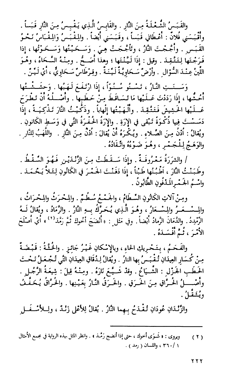 ومنْ آلاتِ الكانونِ السِّطامُ، والجمعُ سطمٌ. والمحرثُ والمحراثُ، والمسعرُ والمسعارُ، وهوَ الَّذِي يحرَّكُ بهِ النَّارُ. والرَّمادُ، ويُقالُ لهُ الرِّمددُ. والدَّمانَ الرَّمادُ أيضاً. وفي مثلٍ: أنضجَ أخوكَ ثمَّ رمَّدَ أيْ أصلحَ الأمرَ، ثمَّ أفسدَهُ.