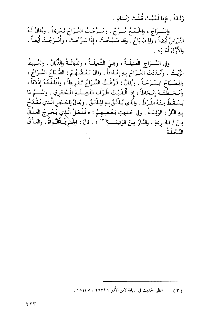 وفي السِّراجِ الفتيلةُ، وهيَ الشَّعيلةُ، والذُّبالةُ والذُّبالُ. والَّسليطُ الزَّيتُ. وأمددتُ السِّراجَ بهِ إمداداً. وقالَ بعضهمْ: الصُّباحُ السِّراجُ، والمصباحُ المسرجةُ. ويُقالُ: قرَّطتُ السِّراجُ تقريطاً، وأذلقتُهُ إذلاقاً، وأمخَطتُهُ إمخاطاً، إِذَا ألقيتَ طرفَ الفتيلةِ المحترقِ. واسمُ ما يسقطُ منهُ القرطُ. والّذي يذلقُ بهِ المذلقُ. ويُقالُ للحجرِ الَّذِي تقدحُ بهِ النّارُ: الوثيمةُ. وفي حديثِ بعضِهمْ: فلعلَّ الَّذِي يخرجُ العذقَ منَ الجريمةِ، والنَّارُ منَ الوثيمةِ. قالَ: الجريمةُ النَّواةُ، والعذقُ النَّخلةُ.