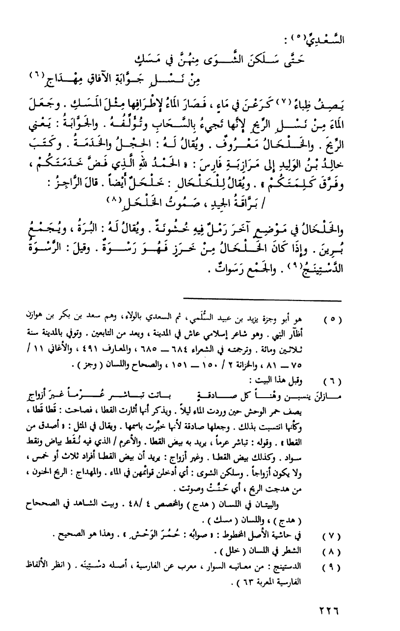 يصفُ ظباءٌ كرعْنَ فِي ماءٍ، فصارَ الماءُ لأطرافِها مثلَ المسكِ. وجعلَ الماءَ منْ نسلِ الرَّيحِ لأنَّها تجيءُ بالسحابِ وتؤلِّفُهُ. والجوَّابةُ: يعْني الرِّيحَ. والخلخالُ معروفٌ. ويُقالُ لهُ: الحجلُ والخدمةُ. وكتبَ خالدُ بنُ الوليدِ إِلَى مرازبةِ فارسَ: الحمدُ للهِ الَّذِي فضَّ خدمتكُمْ، وفرَّقَ كلمتكُمْ. ويُقالُ للخلخالِ: خلخلٌ أيضاً. قالَ الرَّاجزُ:
