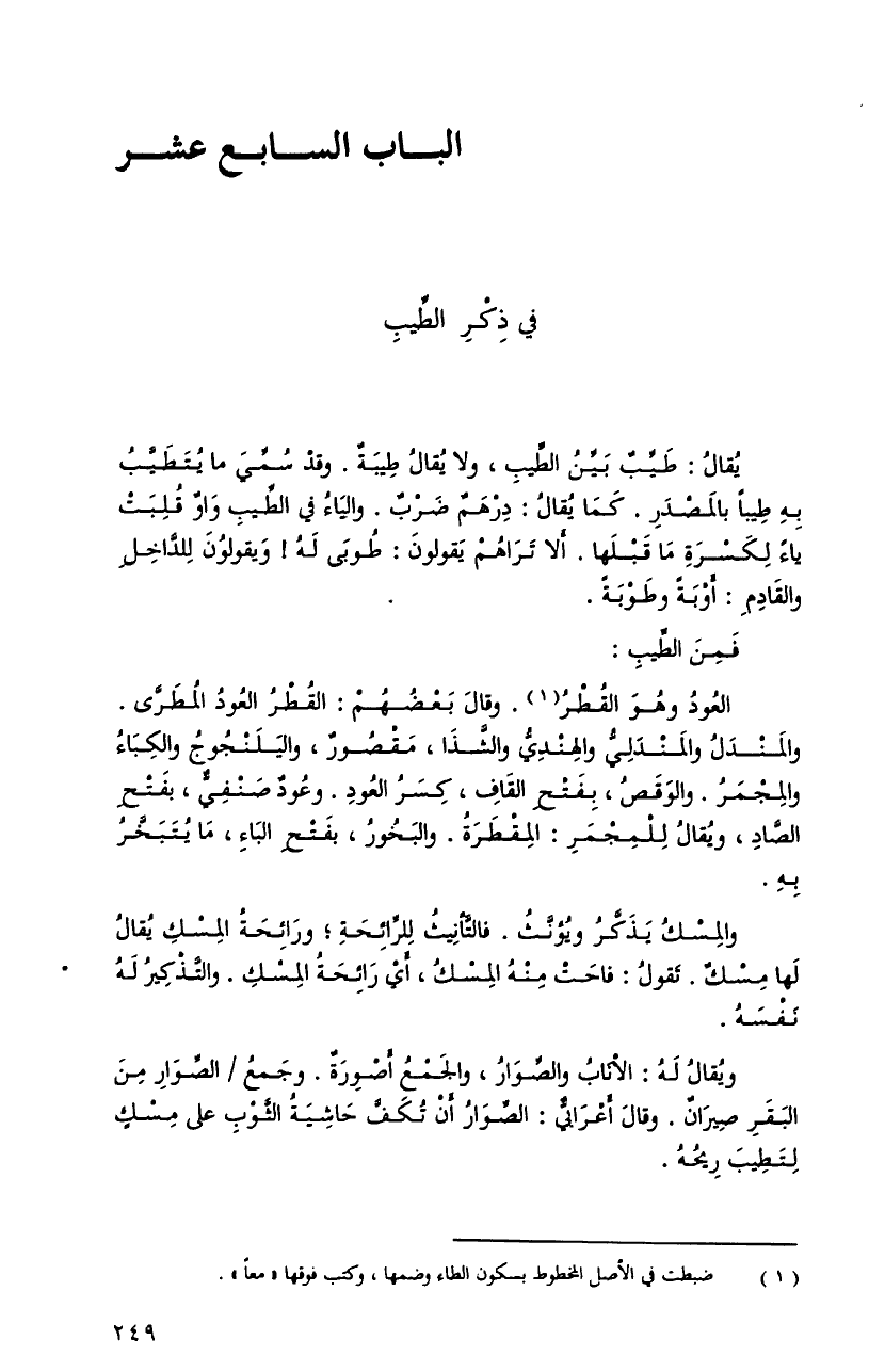 يُقالُ: طيِّبٌ بيِّنُ الطِّيبِ، ولا يُقالُ طيبةٌ. وقدْ سُمِّيَ ما يتطيَّبُ بهِ طيباً بالمصدرِ، كما يُقالُ: درهمٌ ضربٌ. والياءُ فِي الطِّيبِ واوٌ قلِبَتْ ياءٌ لكسرةِ ما قلبها. أَلاَّ تراهمْ يقولونَ: طوبى لهُ! ويقولونَ للدَّاخلِ والقادمِ: أوبةً وطوبةً.