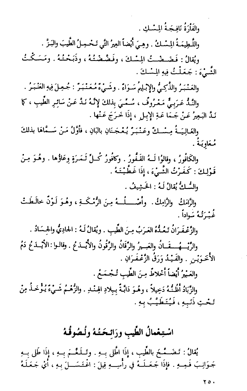 ويُقالُ: فضضْتُ المسكَ، وفضَّضْتُهُ، وذبحْتُهُ. ومسكْتُ الشَّيءَ: جعلْتُ فيهِ المسكَ.