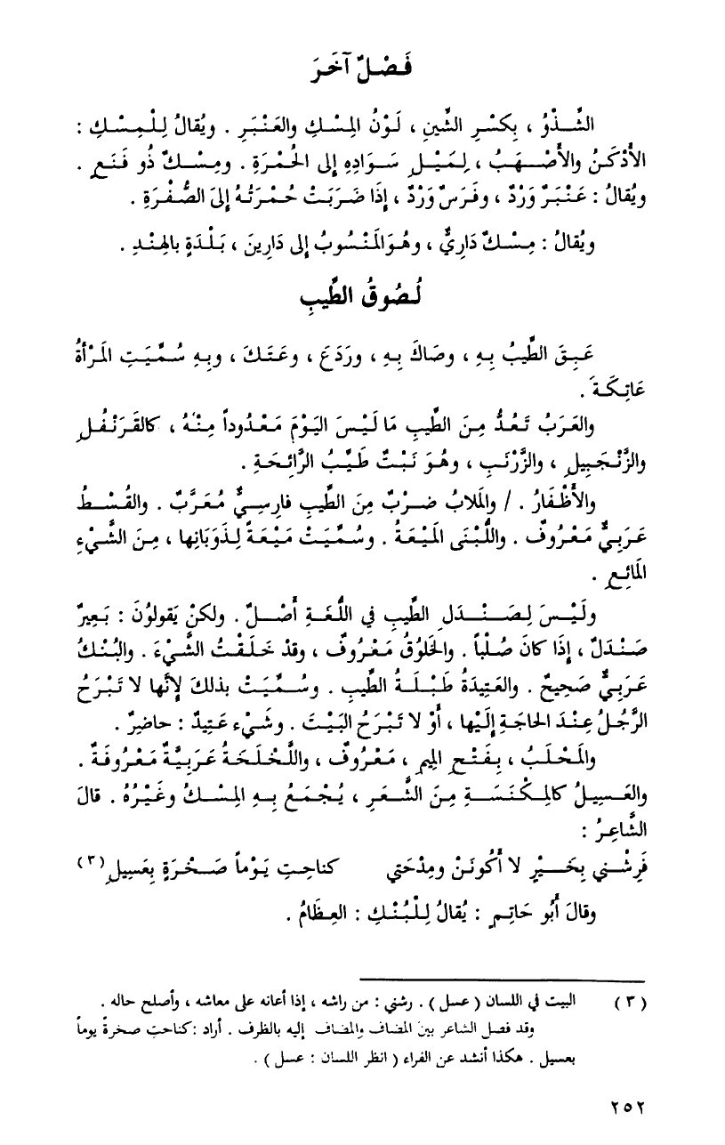 والعربُ تعدُّ منَ الطِّيبِ ما ليسَ اليومَ معدوداً منهُ، كالقرنفلِ والزَّنجبيلِ، والزَّرنبِ، وهوَ نبتٌ طيِّبُ الرَّائحةِ.