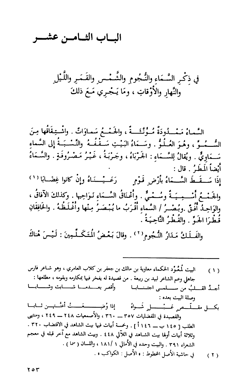 والجمعُ أسميةٌ وسميٌّ. وأعناقُ السَّماءِ نواحيها. وكذلكَ الآفاقُ، والواحدُ أفقٌ. وبصرُ السَّماءِ أقربُ ما يبصرُ منْها وأغلظهُ. والخافقانِ قطرا الجوِّ. والقطرُ النَّاحيةُ.