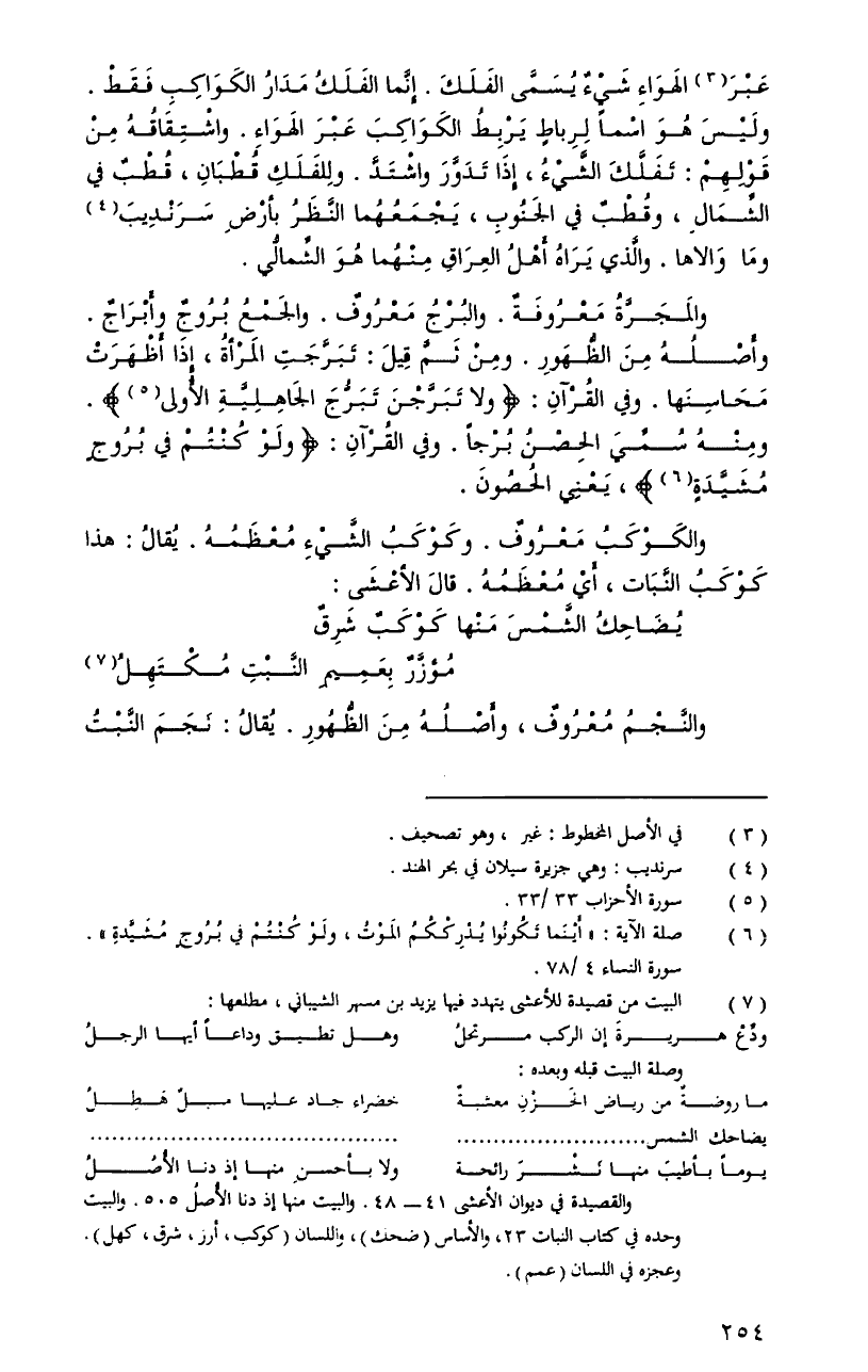 عبرَ الهواءِ شيءٌ يسمَّى الفلكَ. إنَّما الفلكُ مدارُ الكواكبِ فقطْ. وليسَ هوَ اسماً لرباطٍ يربطُ الكواكبَ عبرَ الهواءِ. واشتقاقُهُ منْ قولهمْ: تفلَّكَ الشَّيءُ، إِذَا تدوَّرَ واشتدَّ. وللفلكِ قطبانِ، قطبٌ فِي الشِّمالِ، وقطبٌ فِي الجنوبِ، يجمعهُما النَّظرُ بأرضِ سرنديبَ وما والاها. والّذي يراهُ أهلُ العراقِ منْهما هوَ الشِّمالُّي.