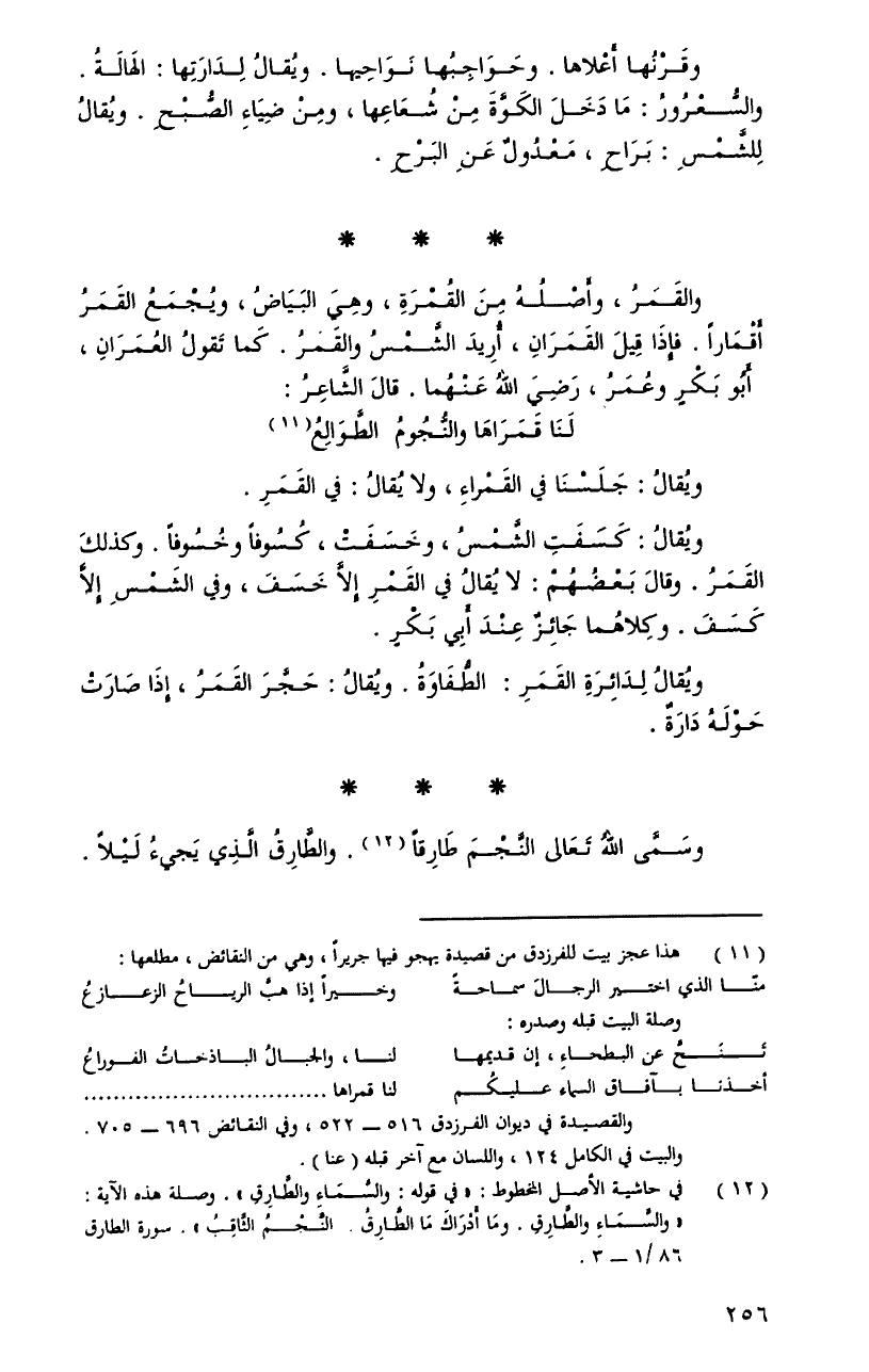 والقمرُ، وأصلهُ منَ القمرةِ، وهيَ البياضُ، ويجمعُ القمرُ أقماراً. فإذا قيلَ القمرانِ، أريدَ الشَّمسُ والقمرُ. كما تقولُ العمرانِ، أبو بكرٍ وعمرُ، رضيَ الله عنْهما. قالَ الشاعرُ: