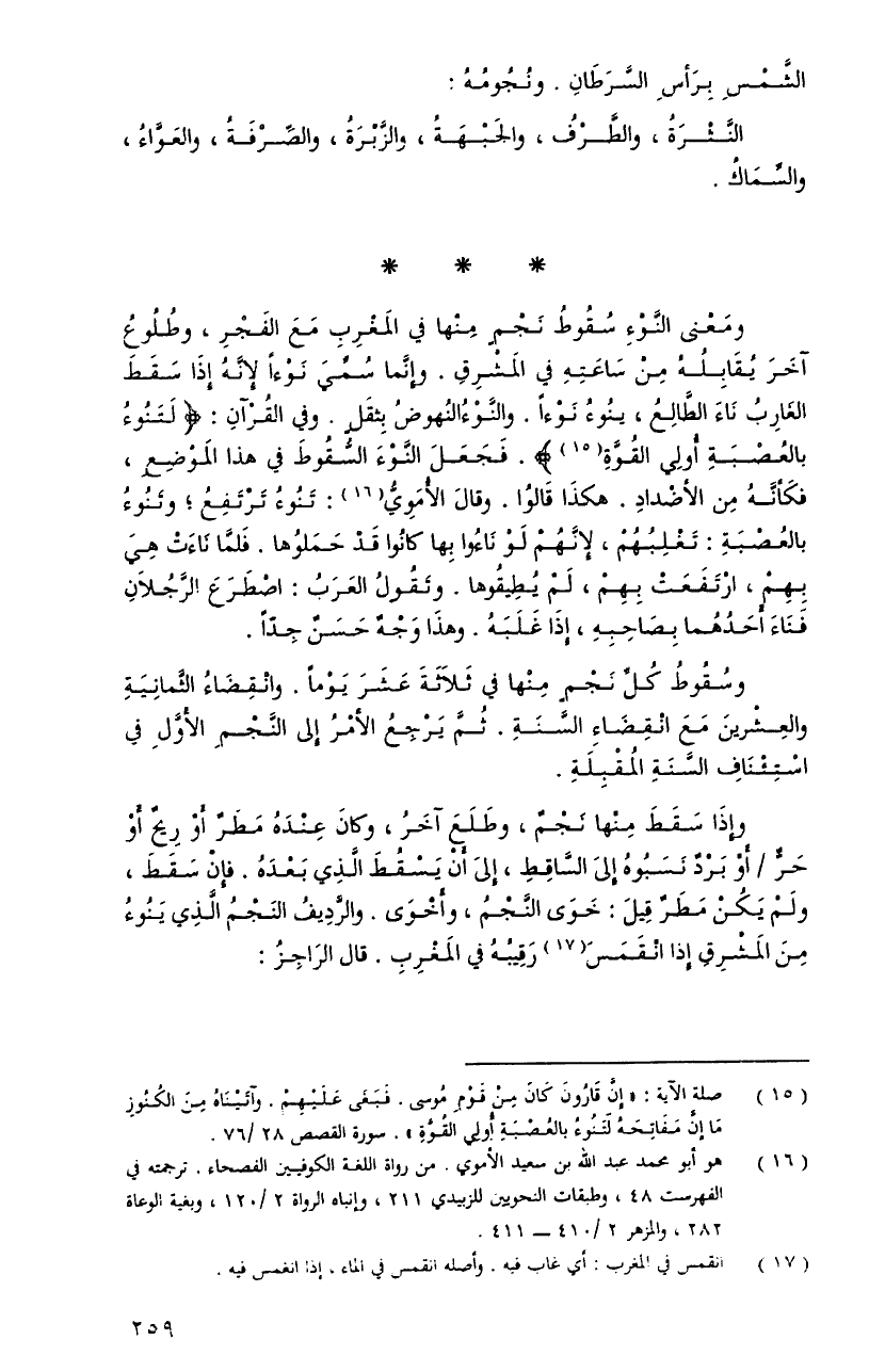 وسقوطُ كلِّ نجمٍ منْها فِي ثلاثةَ عشرَ يوماً. وانقضاءُ الثَّمانيةِ والعشرينَ معَ انقضاءِ السَّنةِ. ثمَّ يرجعُ الأمرُ إِلَى النَّجمِ الأوَّلِ فِي استئناف السَّنةِ المقبلةِ.