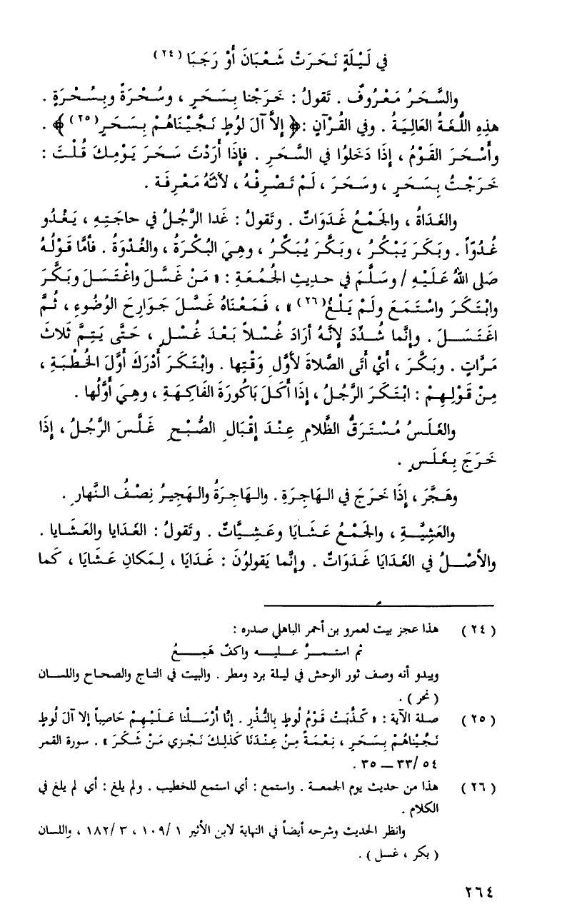 والسَّحرُ معروفٌ. تقولُ: خرجْنا بسحرٍ، وسحرةٌ وبسحرةٍ. هَذِهِ اللُّغةَُ العاليةُ. وفي القرآنِ: {آلَ لُوطٍ نَّجَّيْنَاهُم بِسَحَرٍ}. وأسحرَ القومُ، إِذَا دخلُوا فِي السَّحرِ. فإذا أردتَ سحرَ يومكَ قلتَ: خرجتُ بسحرٍ، وسحرَ، لمْ تصرفهُ، لأنَّهُ معرفة.