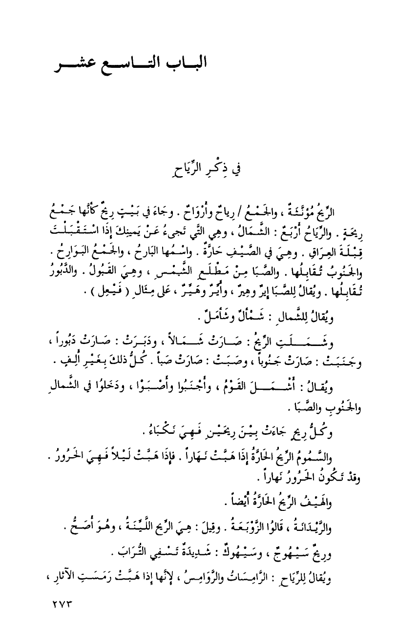 الرِّيحُ مؤنَّثةٌ، والجمعُ رياحٌ وأرواحٌ. وجاء فِي بيتٍ ريحٌ كأنَّها جمعُ ريحةٍ. والرَّياحُ أربعٌ: الشَّمالُ، وهي الَّتِي تجيء عنْ يمينكَ إِذَا استقبلْتَ قبلةَ العراقِ. وهيَ فِي الصَّيفِ حارَّةٌ. واسمُها البارحُ، والجمعُ البوارحُ. والجنوبُ تقابلها. والصَّبا منْ مطلعِ الشَّمسِ، وهيَ القبولُ. والدَّبورُ تقابلها. ويُقالُ للصَّبا إيرٌ وهيرٌ، وأيرٌ وهيِّرٌ، علىَ مثالِ (فيعِل).