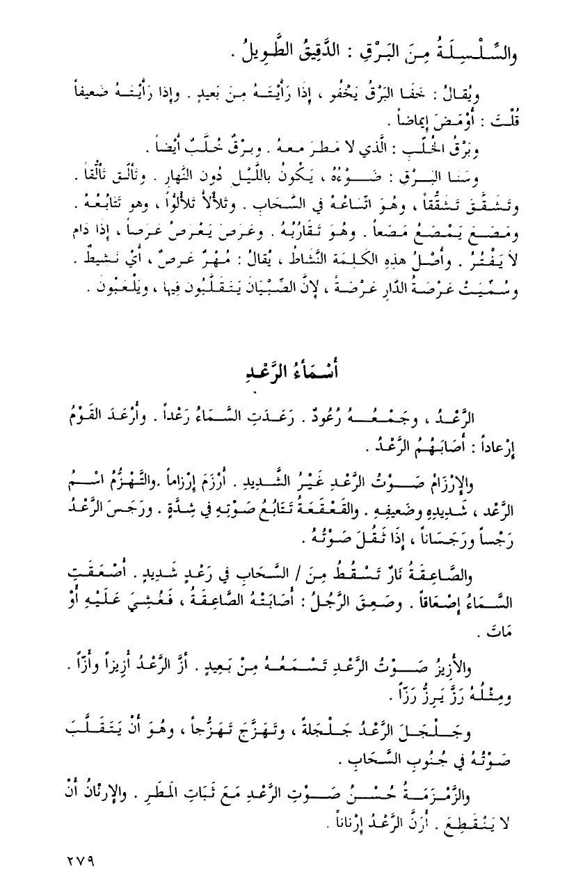 والصَّاعقةُ نارٌ تسقطُ منَ السَّحابِ فِي رعدٍ شديدٍ. أصعقتِ السَّماءُ إصعاقاً. وصَعِقَ الرَّجُلُ: أَصَابَتْهُ الصَّاعِقَةُ، فَغُشِيَ عَلَيْهِ أَوْ مَاتَ. والأَزِيزُ صَوْتَُ الرَّعدِ تسمعُهُ منْ بعيدٍ. أزَّ الرَّعدُ أزيزاً وأزاً ومثلُهُ رزَّ يرزُّ رزاً.