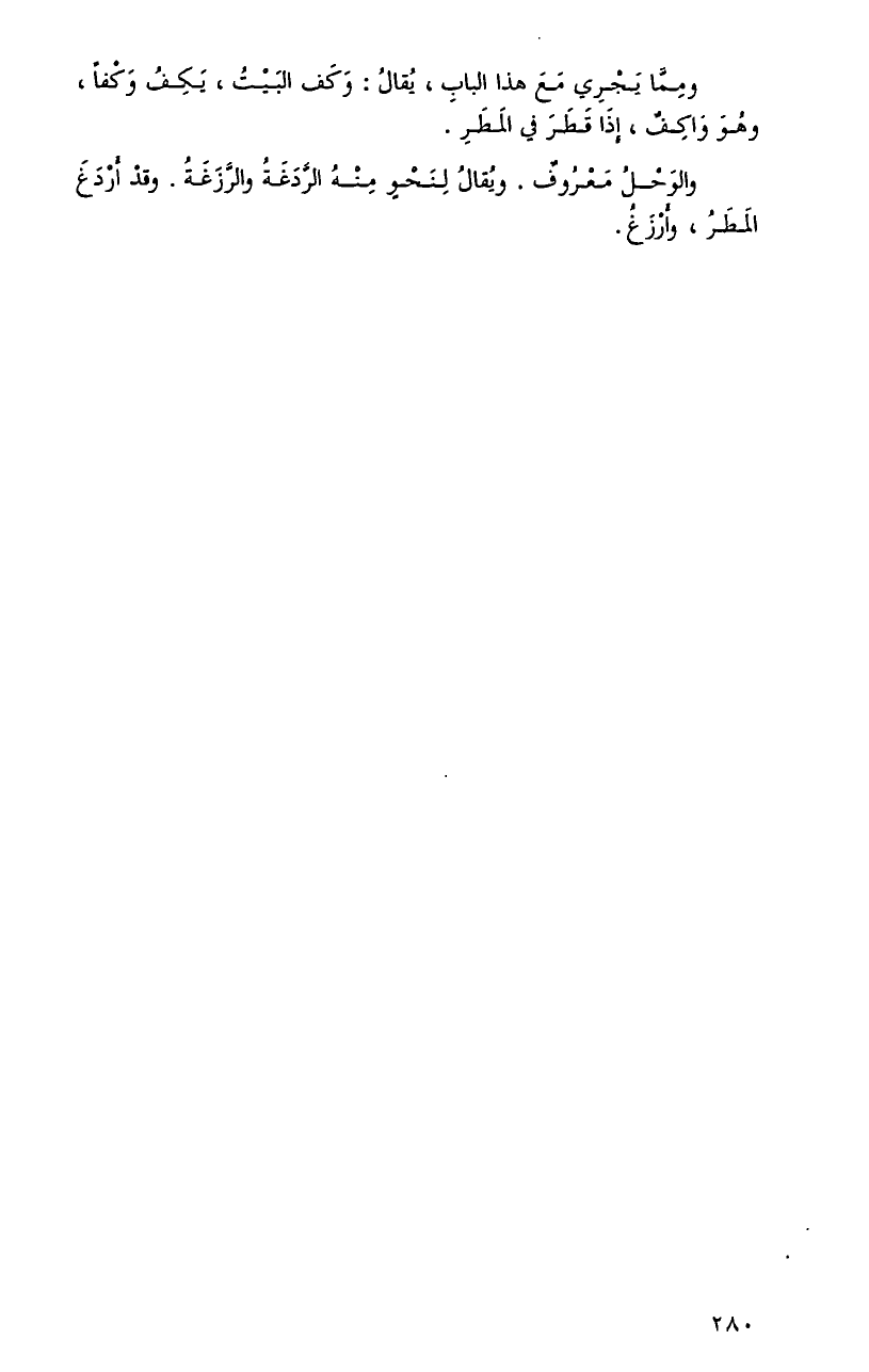 وممَّا يجري معَ هَذَا البابِ، يُقالُ: وكف البيتُ، يكفُ وكفاً، وهوَ واكفٌ، إِذَا قطرَ فِي المطرِ.