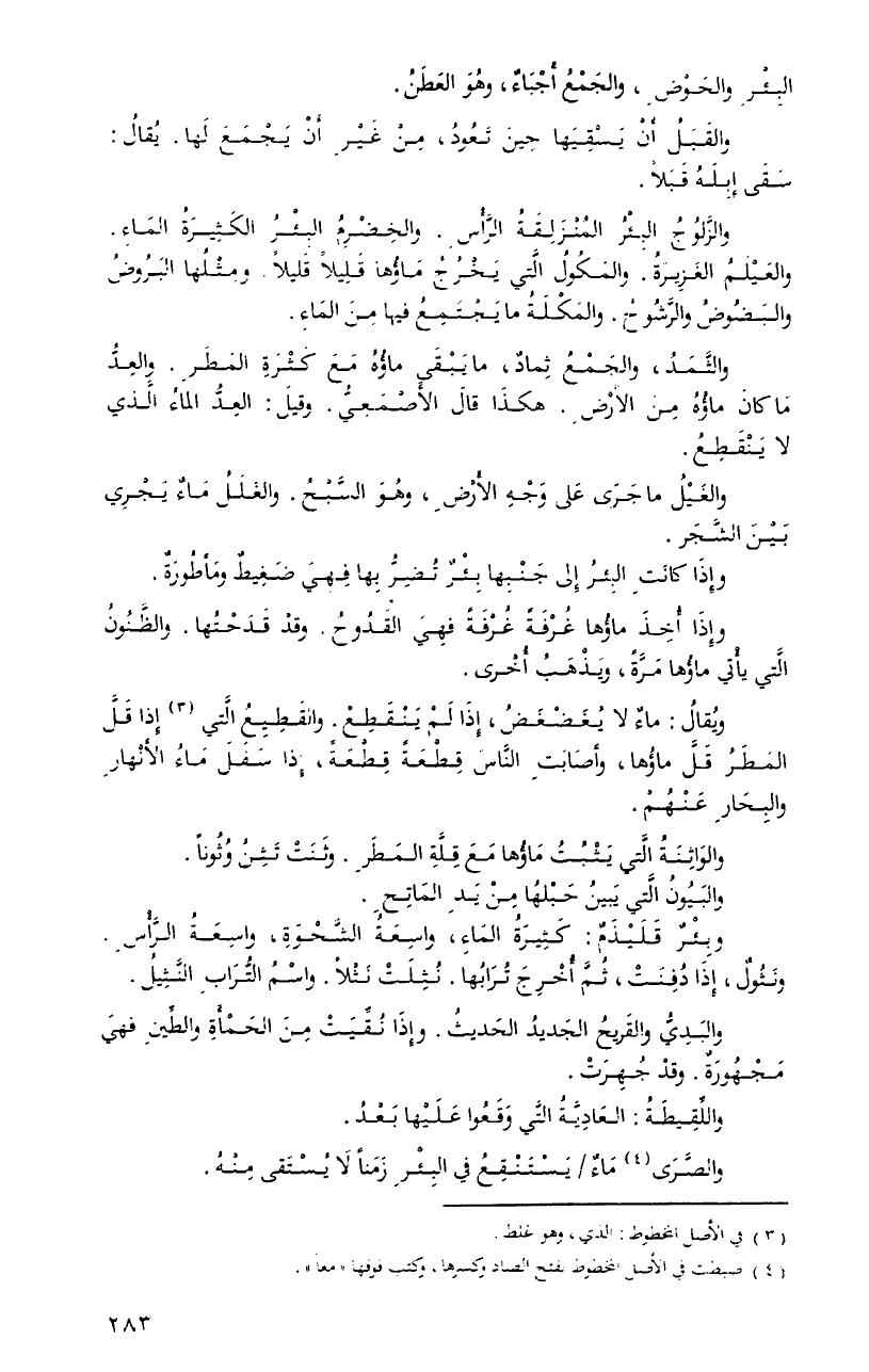 والزَّلوجُ البئرُ المنزلقةُ الرَّأسِ. والخضرمُ البئرُ الكثيرةُ الماءِ. والعيْلَمُ الغزيرةُ. والمكولُ الَّتِي يخرجُ ماؤها قليلاً قليلاً. ومثلُها البروضُ والبضوضُ والرَّشوحُ. والمكْلَةُ ما يجتمعُ فيها منَ الماءِ.