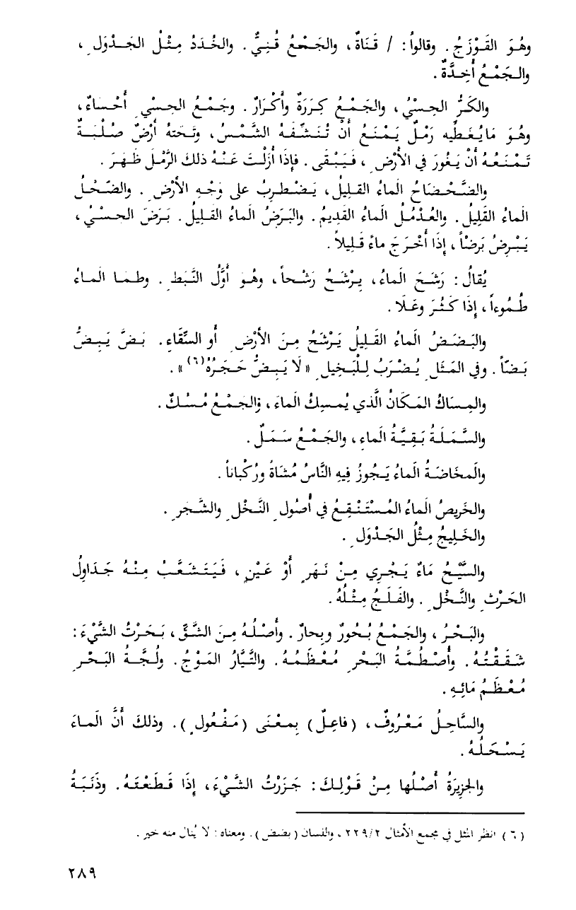 والكرُّ الحسيُ، والجمعُ كررةٌ وأكرارٌ. وجمعُ الحسيِ أحساءٌ، وهوَ ما يغَطِّيه رملٌ يمنعُ أنْ تنشِّفَهُ الشَّمسُ، وتحتهُ أرضٌ صلبةٌ تمنعهُ أنْ يغورَ فِي الأرضِ، فيبقى. فإذا أزلتَ عنْهُ ذلكَ الرَّملَ ظهرَ.