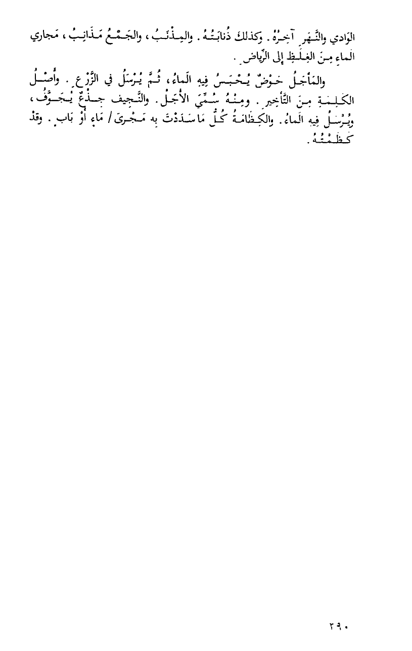 والمأجلُ حوضٌ يحبسُ فيهِ الماءُ، ثمَّ يرسلُ فِي الزَّرعِ. وأصلُ الكلمةِ منَ التَّأخيرِ. ومنهُ سُمِّيَ الأجلُ. والنَّجيف جذعٌ يجوَّفُ، ويرسلُ فيهِ الماءُ. والكظامةُ كلُّ ما سددْتَ بهِ مجرىَ
