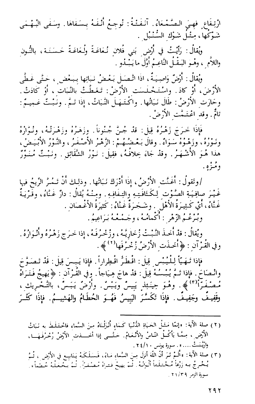 فإذا تهيّأ لليبسِ قيلَ: اقطرَّ اقطراراً. فإذا يبسَ قيلَ: تصوَّحَ وانصاحَ. فإذا تمَّ يبسهُ قيلَ: قدْ هاجَ هياجاً. وفي القرآنِ: {يَهِيجُ فَتَرَاهُ مُصْفَرّاً}. وهُو حينئذٍ يبيسٌ ويبسٌ. وأرضٌ يبسٌ، بالتَّحريكِ، وقفيفٌ وجفيفٌ. فإذا تكسَّرَ اليبيسُ فهوَ الحطامُ والهشيمُ. فإذا كثُرَ