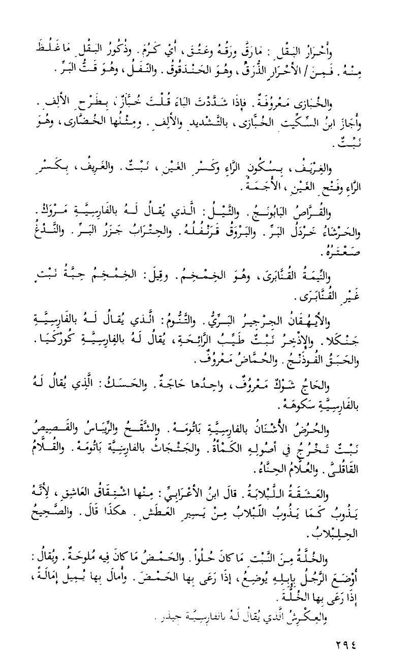 والأيهُقانُ الجرجيرُ البرِّيُّ. والتَّنُّومُ: الَّذِي يُقالُ لهُ بالفارسيَّةِ جنكلا. والإذْخرُ نبتٌ طيَّبُ الرَّائحةِ، يقالُ لهُ بالفارسيَّةِ كوركيا. والحبقُ الفوذنجُ. والحمَّاضُ معروفٌ.