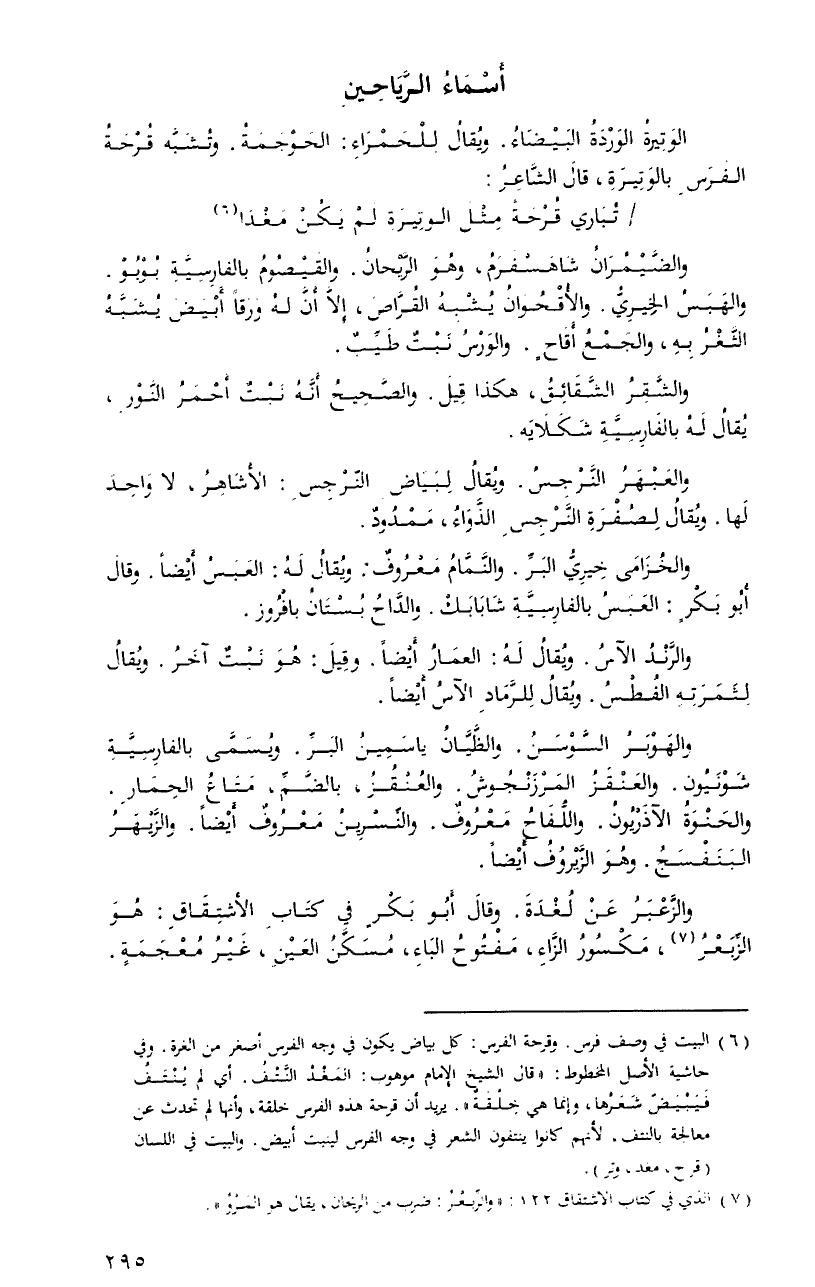 والضَّيْمُرَانُ شاهسفرمُ، وهوَ الرَّيحانُ. والقيصومُ بالفارسيَّةِ بوبوْ. والهبسُ الخيريُّ. والأقحوانُ يشبهُ القرَّاص، إِلاَّ أنَّ لهُ ورقاً أبيضُ يشبَّهُ الثَّغرُ بهِ، والجمعُ أقاحٍ. والورسُ نبتٌ طيِّبٌ.