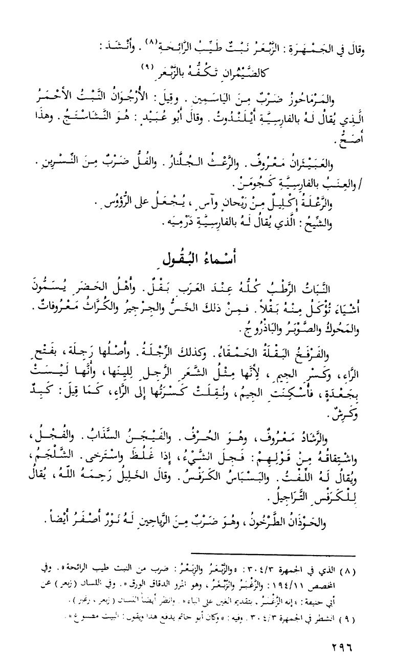 والرَّشادُ معروفٌ، وهوَ الحرفُ. والفيجنُ السَّذابُ. والفجلُ، واشتقاقُهُ منْ قولهمْ: فجلَ الشَّيءُ، إِذَا غلظَ واسترخى. الشَّلجمُ، ويُقالُ لهُ اللِّفتُ. والبسباسُ الكرفسُ. وقالَ الخليلُ رحمهُ اللهُ، يُقالُ للكرفسِ التَّراجيلُ.