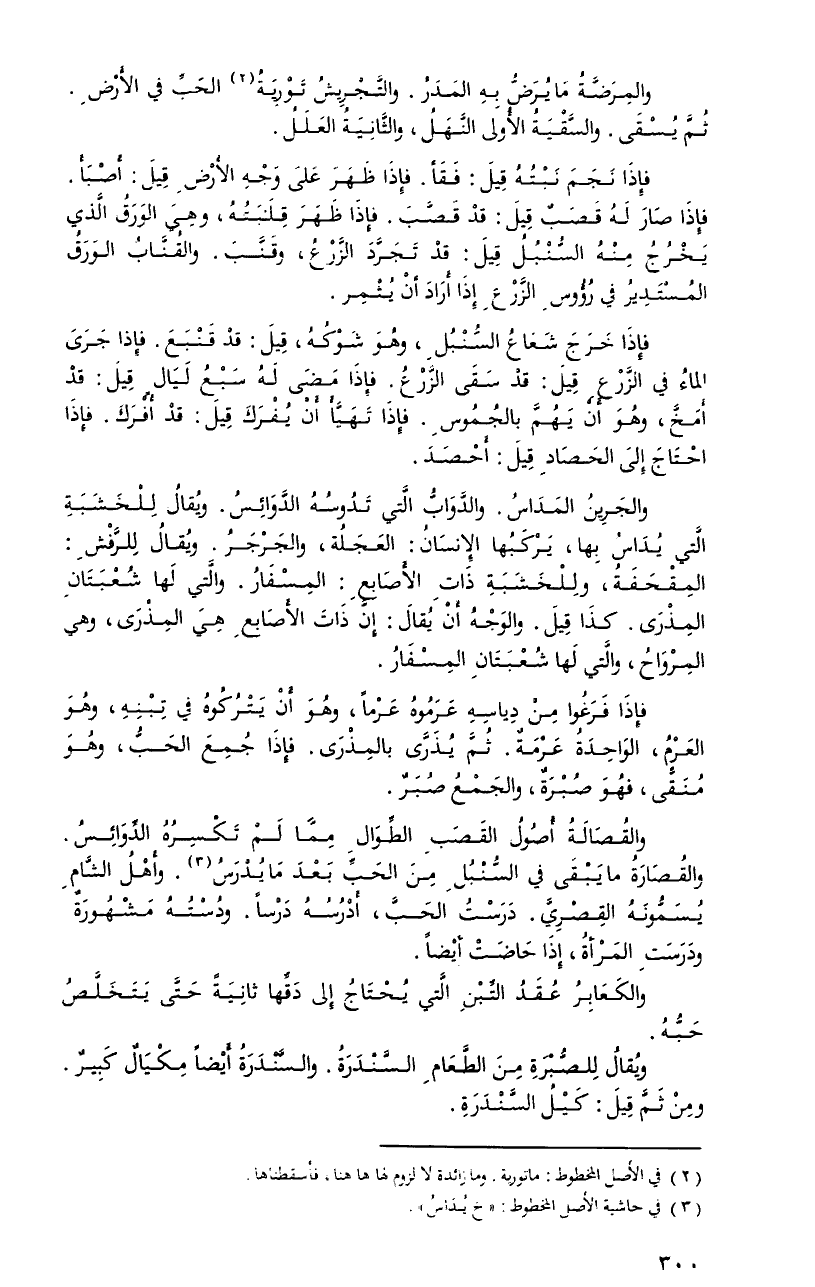 فإذا نجمَ نبتهُ قيلَ: فقأ. فإذا ظهرَ على وجهِ الأرضِ. قيلَ: أصبأ. فإذا صارَ لهُ قصبٌ قيلَ: قدْ قصَّبَ. فإذا ظهرَ قلنبتُهُ، وهيَ الورقُ الَّذِي يخرجُ منهُ السُّنبلُ قيلَ: قدْ تجرَّدَ الزَّرعُ، وقنَّبَ. والقُنَّابُ الورقُ المستديرُ فِي رؤوسِ الزَّرعِ إِذَا أرادَ أنْ يثمرَ.