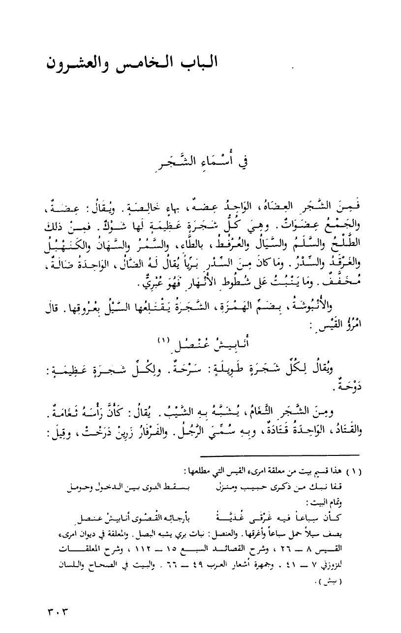 ومنَ الشَّجرِ الثَّغامُ، يشبَّهُ بهِ الشَّيبُ. يُقالُ: كأنَّ رأسهُ ثغامةٌ. والقتادُ، الواحدةُ قتادةٌ، وبهِ سُمِّيَ الرَّجلُ. والفرفارُ زرينْ درختْ، وقيلَ: