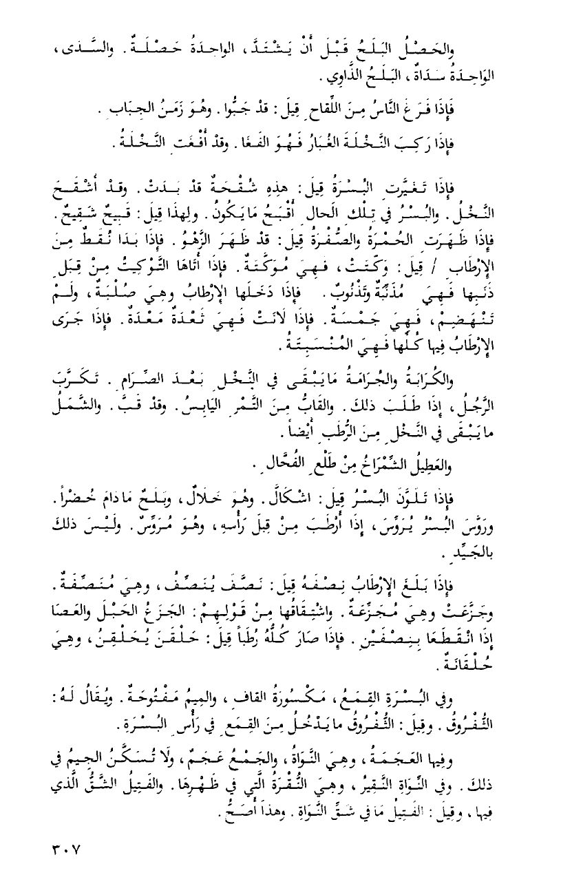 فإذَا تغيَّرتِ البسرةُ قيلَ: هَذِهِ شقحةٌ قدْ بدتْ. وقدْ أشقحَ النَّخْلُ. والبسرُ فِي تلكِ الحالِ أقبحُ مَا يكونُ. ولهذَا قيلَ: قبيحٌ شقيحٌ. فإذَا طهرَتِ الحمرةُ والصُّفرةُ قيلَ: قدْ ظهرَ الزَّهوُ. فإذَا بدَا نقطٌ منَ الإرطابِ قيلَ: وكّتتْ، فهيَ موكَّتةٌ. فإذَا أتاهَا التَّوكيتُ منْ قبلِ ذنبِها فهيَ مذنِّبةٌ وتذنوبٌ. فإذَا دخلَها الإرطابُ وهيَ صلبةٌ، ولمْ تنهضِمْ، فهيَ جمسةٌ. فإذا لانتْ فهيَ ثعدةٌ معدةٌ. فإذَا جرَى الإرطابُ فِيها كلِّها فهيَ المنسبتةُ.