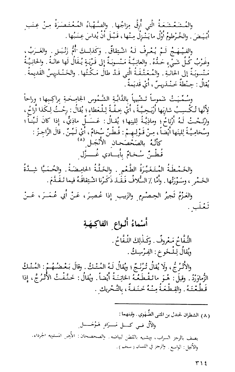 والفيهجُ لمْ يعرفْ لهُ اشتقاقٌ. وكذلكَ أمُّ زنبقٍ. والغربُ، وغربُ كلِّ شيءٍ حدُّهُ. والعانيَّةُ منسوبةٌ إِلَى قريةٍ يُقالُ لَها عانةُ. والحانيَّةُ منسوبةٌ إِلَى الحانةِ. والمعتَّقةُ الَّتِي قدْ طالَ مكثُها. والخندريسُ القديمةُ. يُقالُ: حنطةٌ خندريسٌ، أيْ قديمةٌ.