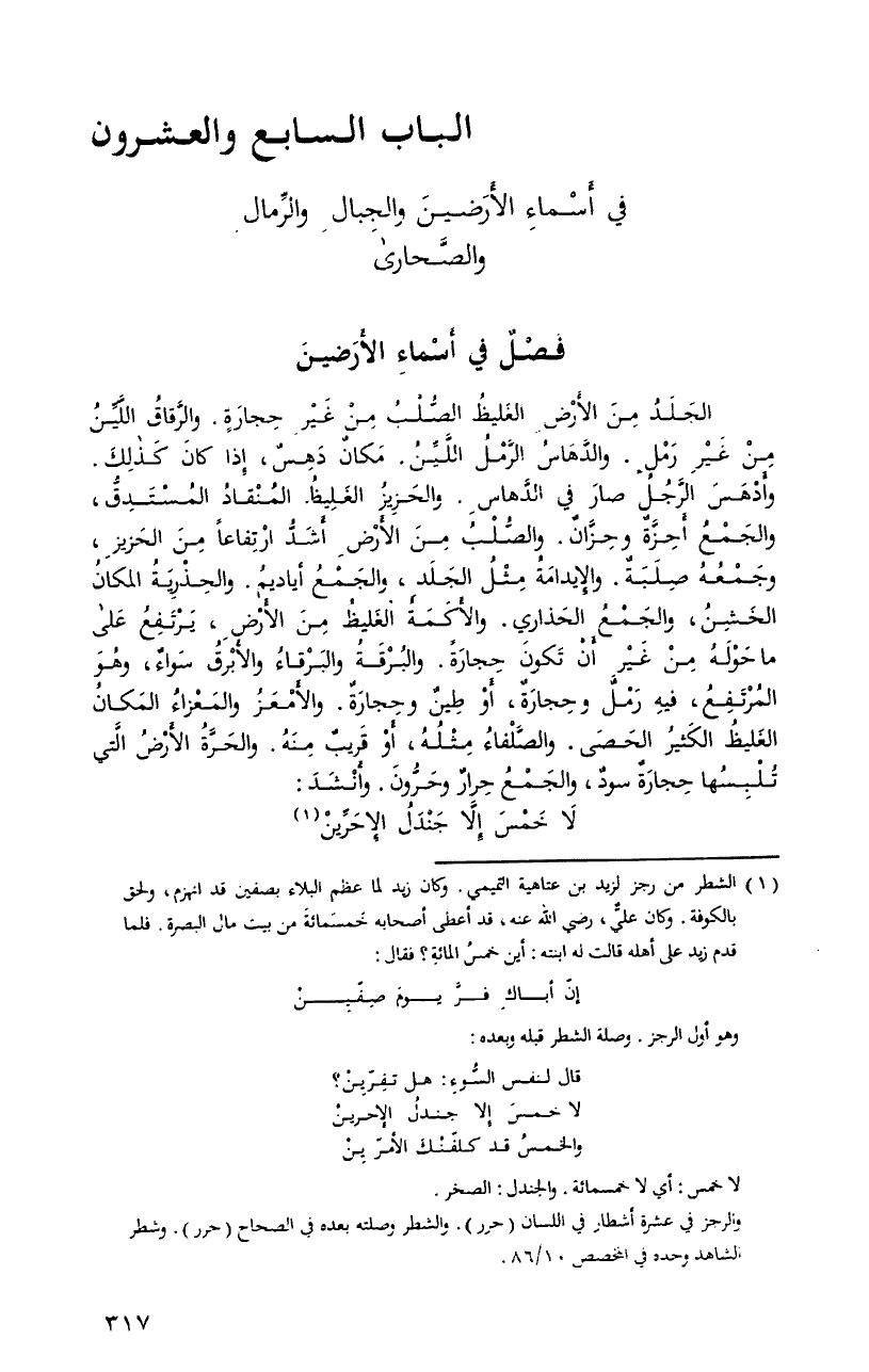 الجلدُ منَ الأرضِ الغليظُ الصُّلبُ منْ غيرِ حجارةٍ. والرَّقاقُ اللَّيِّنُ منْ غيرِ رملٍ. والدَّهاسُ الرَّملُ اللَّيِّنُ. مكانٌ دهسٌ. إِذَا كانَ كذلِكَ. وأدهسَ الرَّجلُ صارَ فِي الدَّهاسِ. والحزيزُ الغليظُ المنقادُ المستدقُّ، والجمعُ أحزَّةٌ وحزَّانٌ. والصُّلبُ منَ الأرضِ أشدُّ ارتفاعاً منَ الحزيزِ، وجمعهُ صلبةٌ. والإيدامةُ مثلُ الجلدِ، والجمعُ أياديمُ. والحذريةُ المكانُ الخشنُ، والجمعُ الحذارِي. والأكمةُ الغليظُ من الأرضِ، يرتفعُ على ما حولهُ منْ غيرِ أنْ تكونَ حجارةً. والبرقةُ والبرقاءُ والأبرقُ سواءٌ، وهوَ المرتفعُ، فيهِ رملٌ وحجارةٌ، أوْ طينٌ وحجارةٌ. والأمعزُ والمعزاءُ المكانُ الغليظُ الكثيرُ الحصَى. والصَّلفاءُ مثلهُ، أوْ قريبٌ منهُ. والحرَّةُ الأرضُ الَّتِي تلبسُها حجارةٌ سودٌ، والجمعُ حرارٌ وحرُّونَ وأنشدَ: